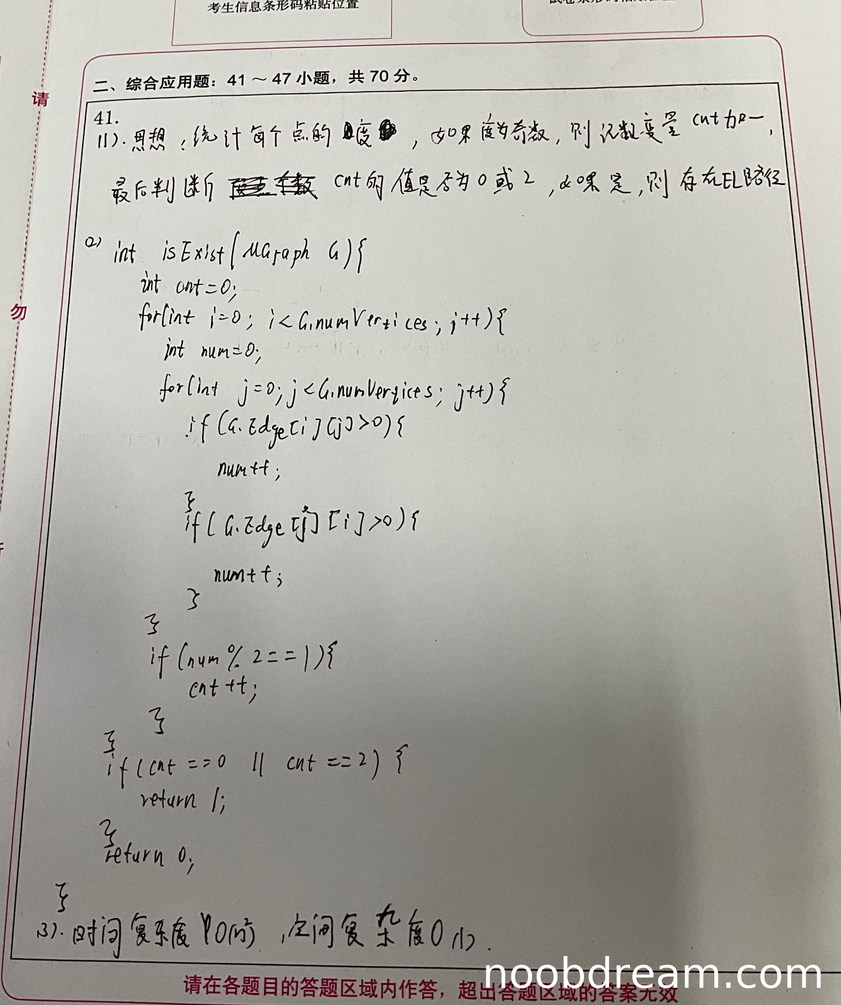 学生给出的基本设计思想与标准答案一致:统计每个顶点的度,计算度为奇数的顶点个数,判断是否为0或2。思路完全正确,表述清晰。得4分。