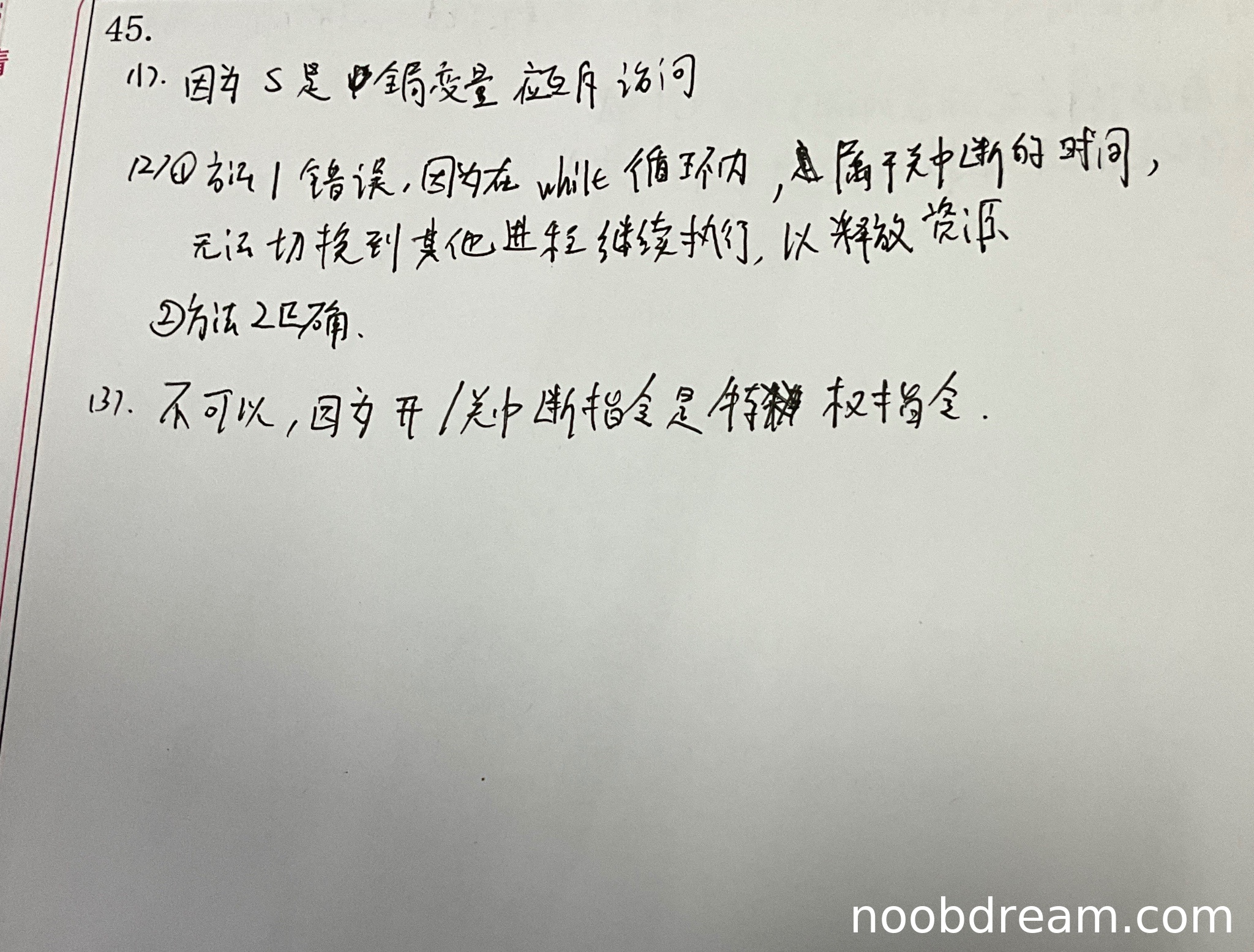 学生正确指出方法1错误("因为在while循环内,属于关中断的时间,无法切换到其他进程继续执行,以释放资源"),这与标准答案"其他进程无法修改S的值,while语句陷入死循环"意思一致。