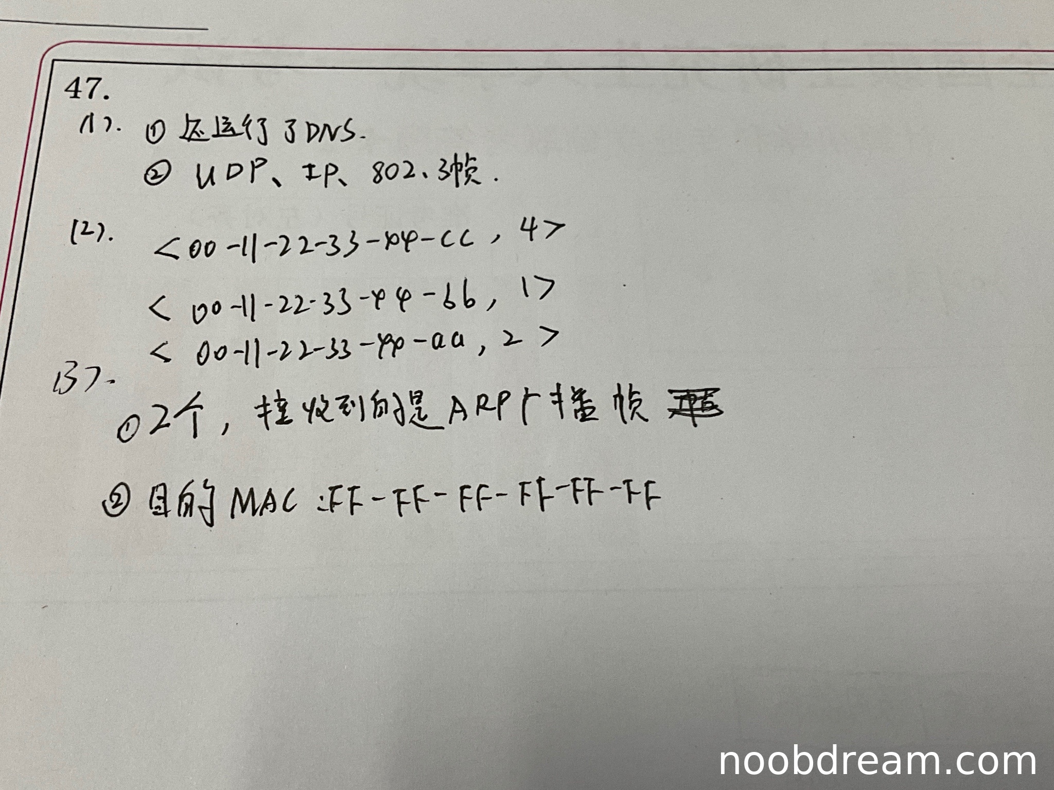学生正确回答接收到2个帧,正确指出是ARP广播帧,目的MAC地址为FF-FF-FF-FF-FF-FF。与标准答案完全一致。得3分。