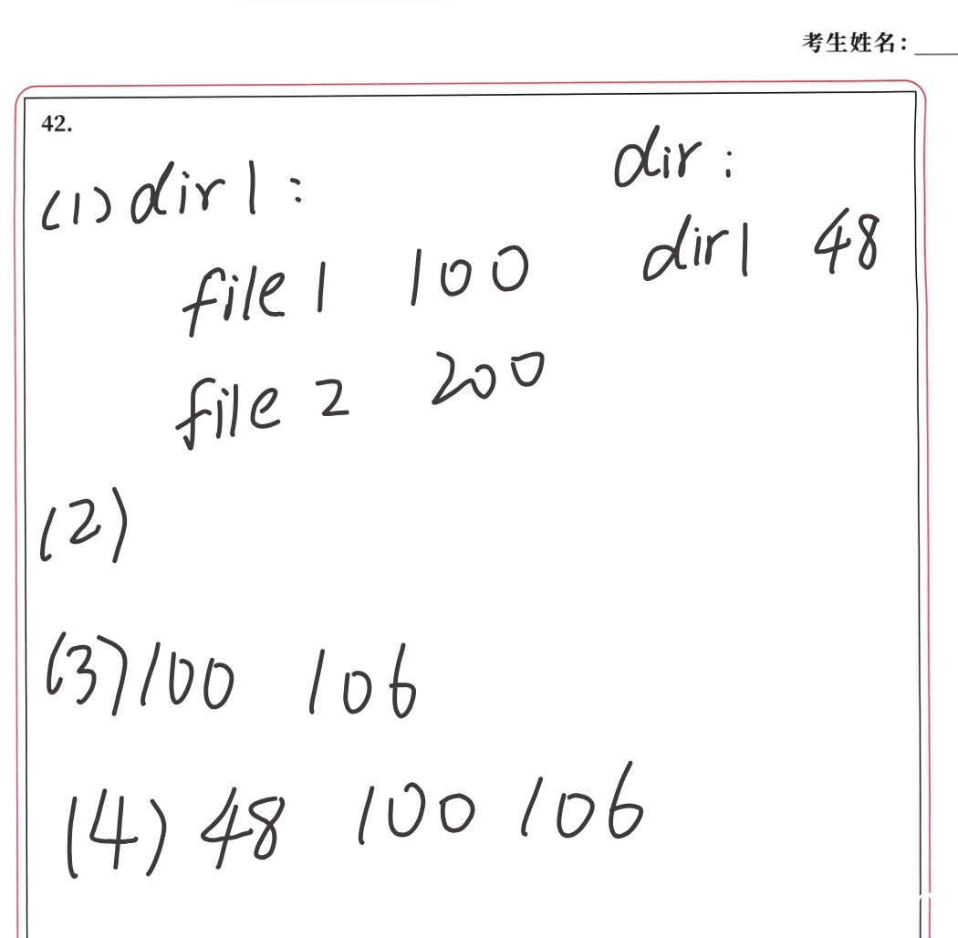学生答案中给出了"48 100 106",这包含了需要访问的目录文件dir1所在的48号簇和文件file1的106号簇,但多了一个100号簇。根据题目要求,读取第5000个字节只需要访问dir1目录文件(48号簇)和file1的106号簇,100号簇不需要访问。因此扣1分。得1分。