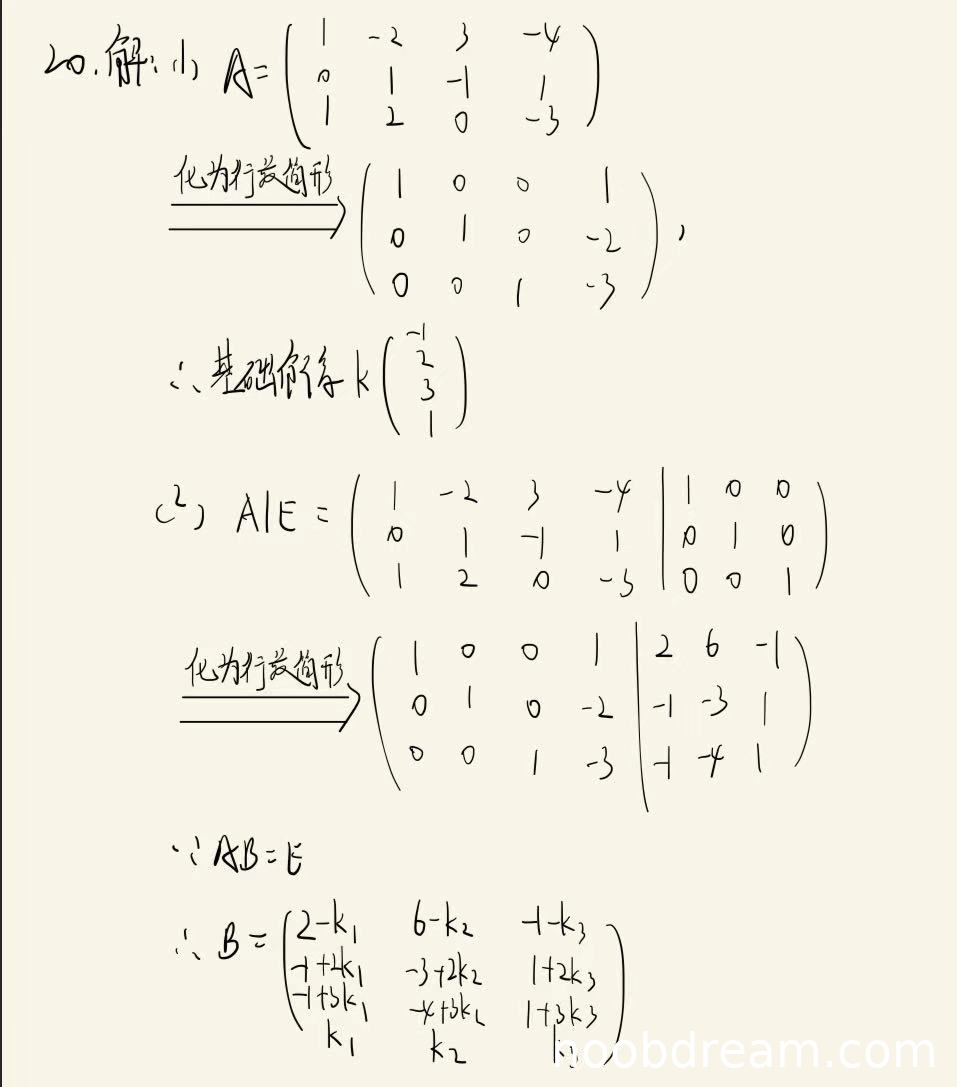学生正确将矩阵A化为行最简形,并得到了正确的基础解系ξ=(-1,2,3,1)ᵀ。虽然表达形式为kξ,但这与标准答案的基础解系一致。计算过程和结果完全正确。