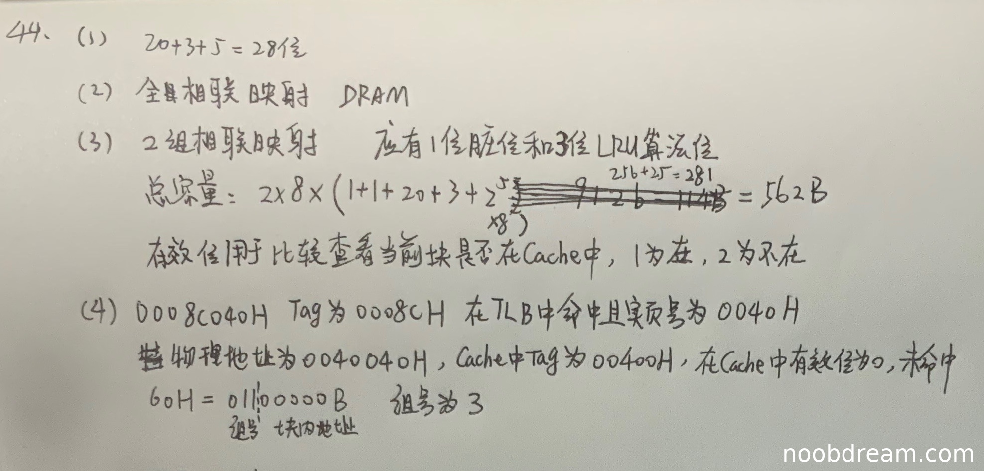 第二问:学生回答“DRAM”错误,标准答案为SRAM。TLB作为页表缓存,需要高速访问,应采用SRAM。扣2分。