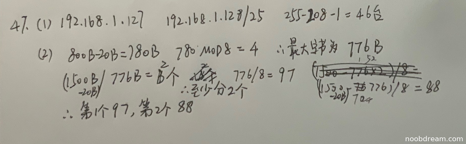 第一问:学生正确计算"800B-20B=780B"和"780 MOD 8=4",得出"最大字节为776B",与标准答案一致,得1分。