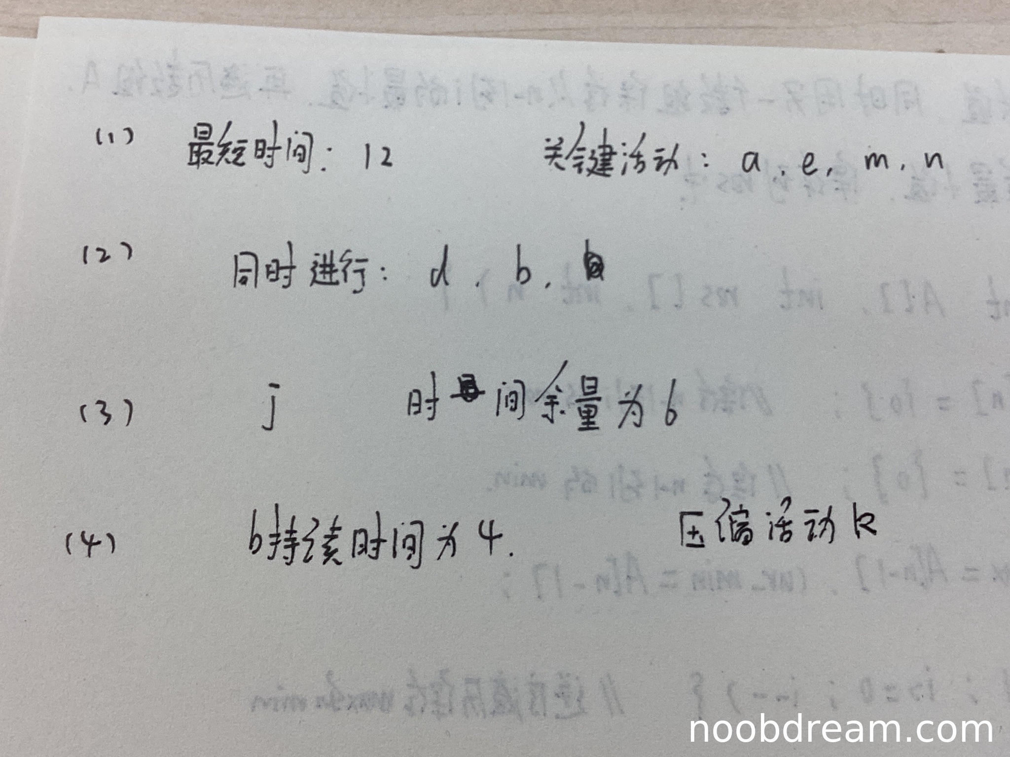 学生回答最短时间为12,关键活动为a、e、m、n,与标准答案完全一致。得4分。