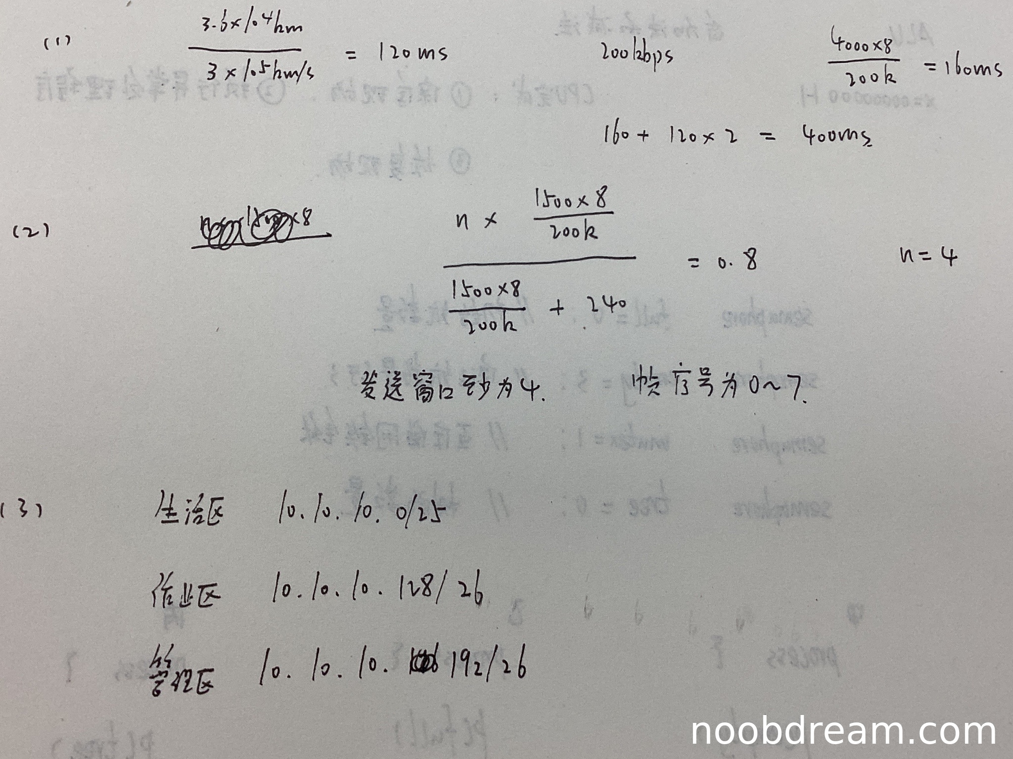 学生答案中,单向传播时延120ms正确,最大吞吐量200kbps正确,但文件传输时间计算错误。标准答案为280ms,学生计算为400ms(第一次识别)或400ms(第二次识别)。错误原因:学生计算中包含了两次单向传播时延(120×2),但文件传输时间应为传输时延加上一次往返时延(即传输时延+2×传播时延),但根据标准答案,这里应为传输时延160ms加上一次传播时延120ms(即160+120=280ms)。学生多算了一次传播时延,属于逻辑错误。因此扣1分。得分为2分。