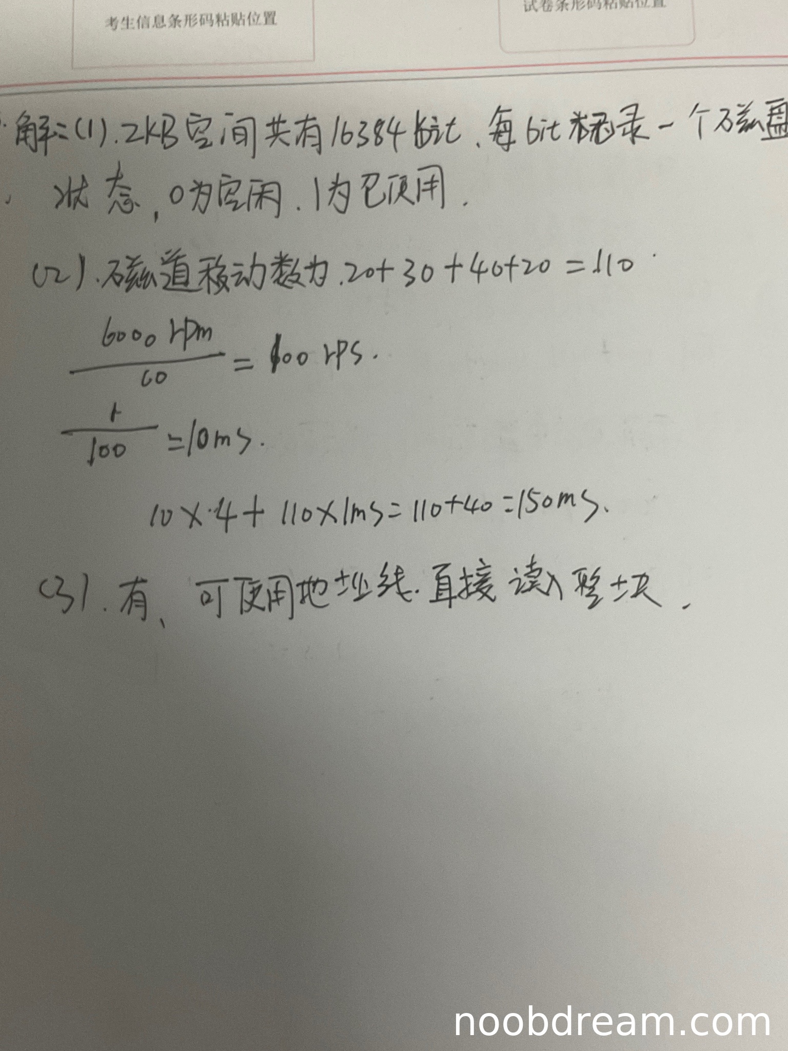 学生第一次识别结果提到"每6bit记录一个磁盘状态",这是错误的,因为标准答案使用位图管理,每1位对应一个磁盘块。但第二次识别结果正确指出"每bit记录一个磁盘状态",符合位图管理方法。考虑到两次识别中至少有一次正确,且2KB空间正好管理16384个磁盘块的计算正确,给满分2分。