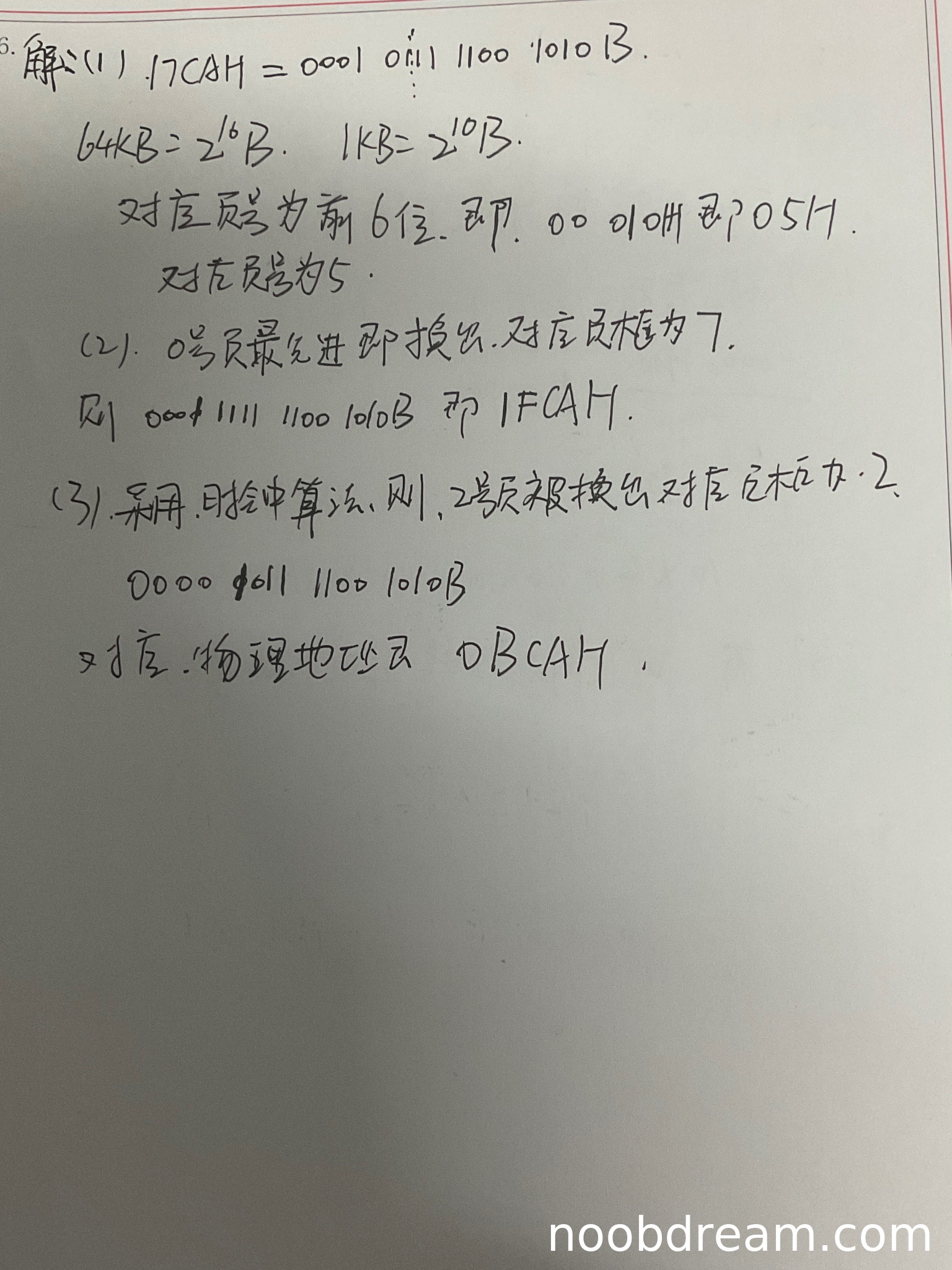 学生正确采用CLOCK算法,指出换出2号页并装入2号页框,但物理地址计算错误。第二次识别中二进制地址0000 0111...对应页框号应为0000 0010(2号页框),学生错误写成0000 0111(7号页框),导致物理地址0BCAH错误(正确应为0BCAH对应0000 1011...)。因页框号选择错误属于逻辑错误,扣1分。得2分。