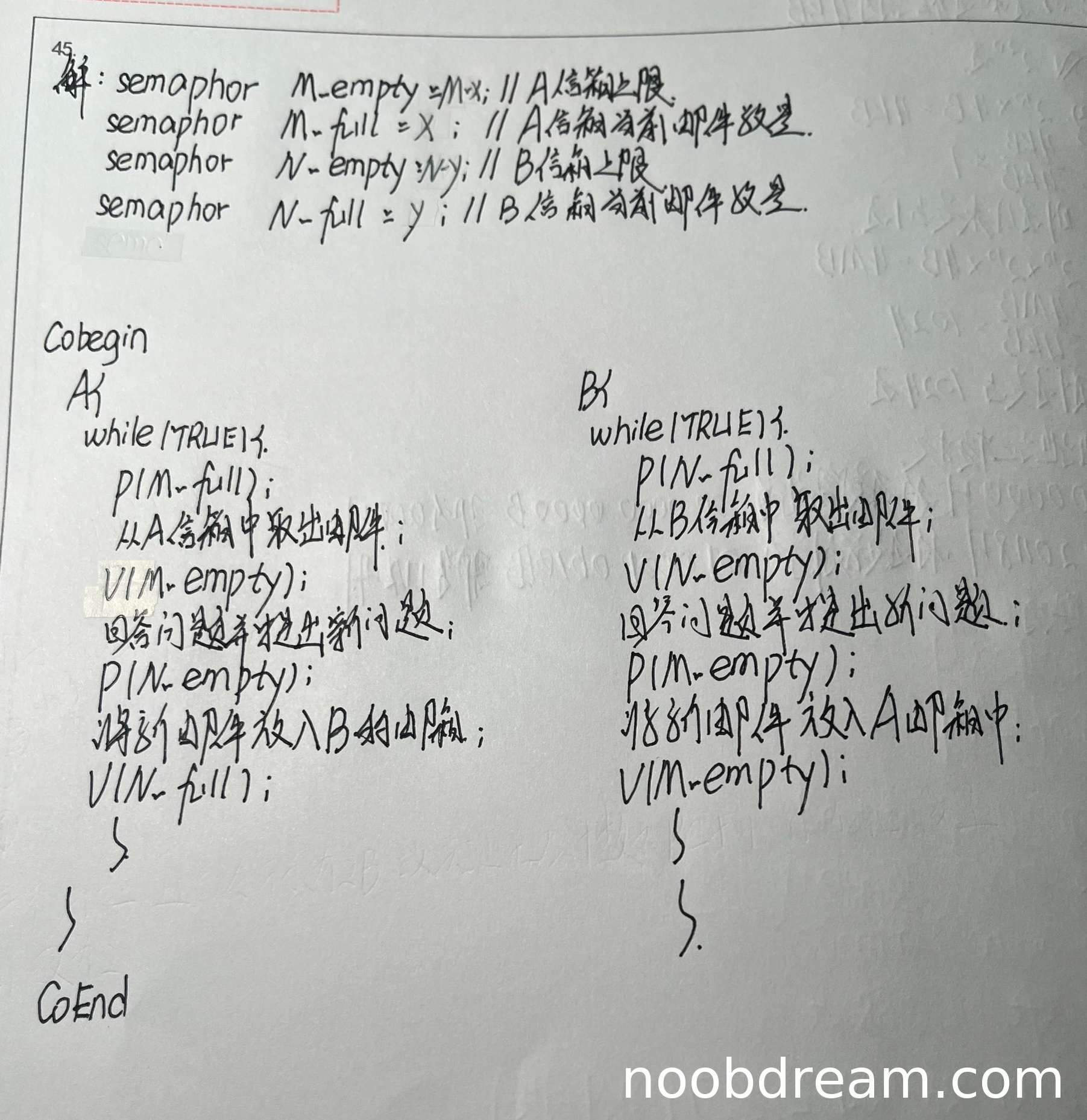 理由:学生定义了四个信号量,分别对应A、B信箱的空闲和满状态,初值设置基本正确(M_empty=M-x, M_full=x, N_empty=N-y, N_full=y)。但存在以下问题:①信号量拼写错误(应为semaphore);②缺少互斥信号量,无法保证对信箱操作的互斥性。扣1分。