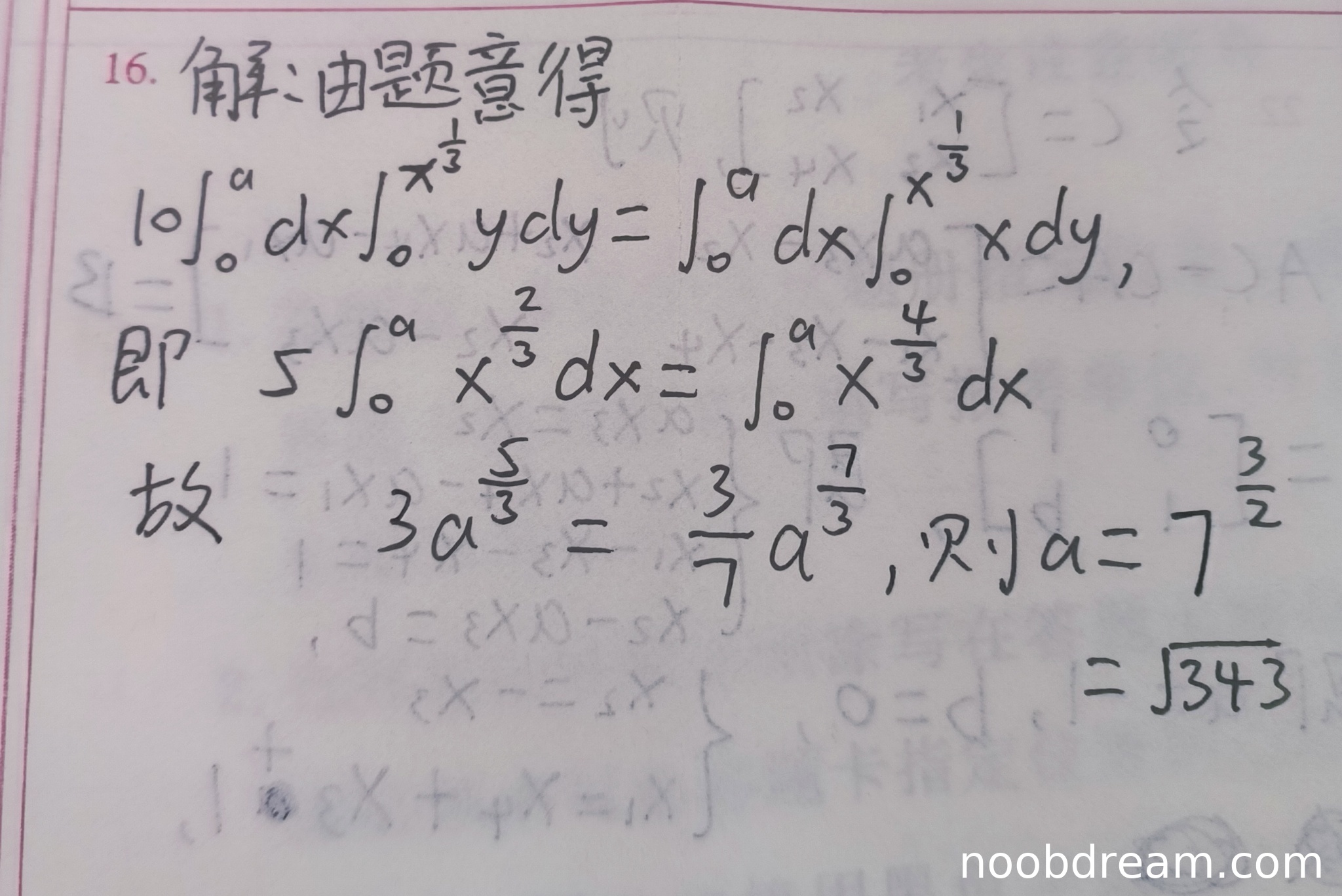 - 学生建立的方程是 \(10\int_{0}^{a}dx\int_{0}^{x^{1/3}} y dy = \int_{0}^{a}dx\int_{0}^{x^{1/3}} x dy\)。