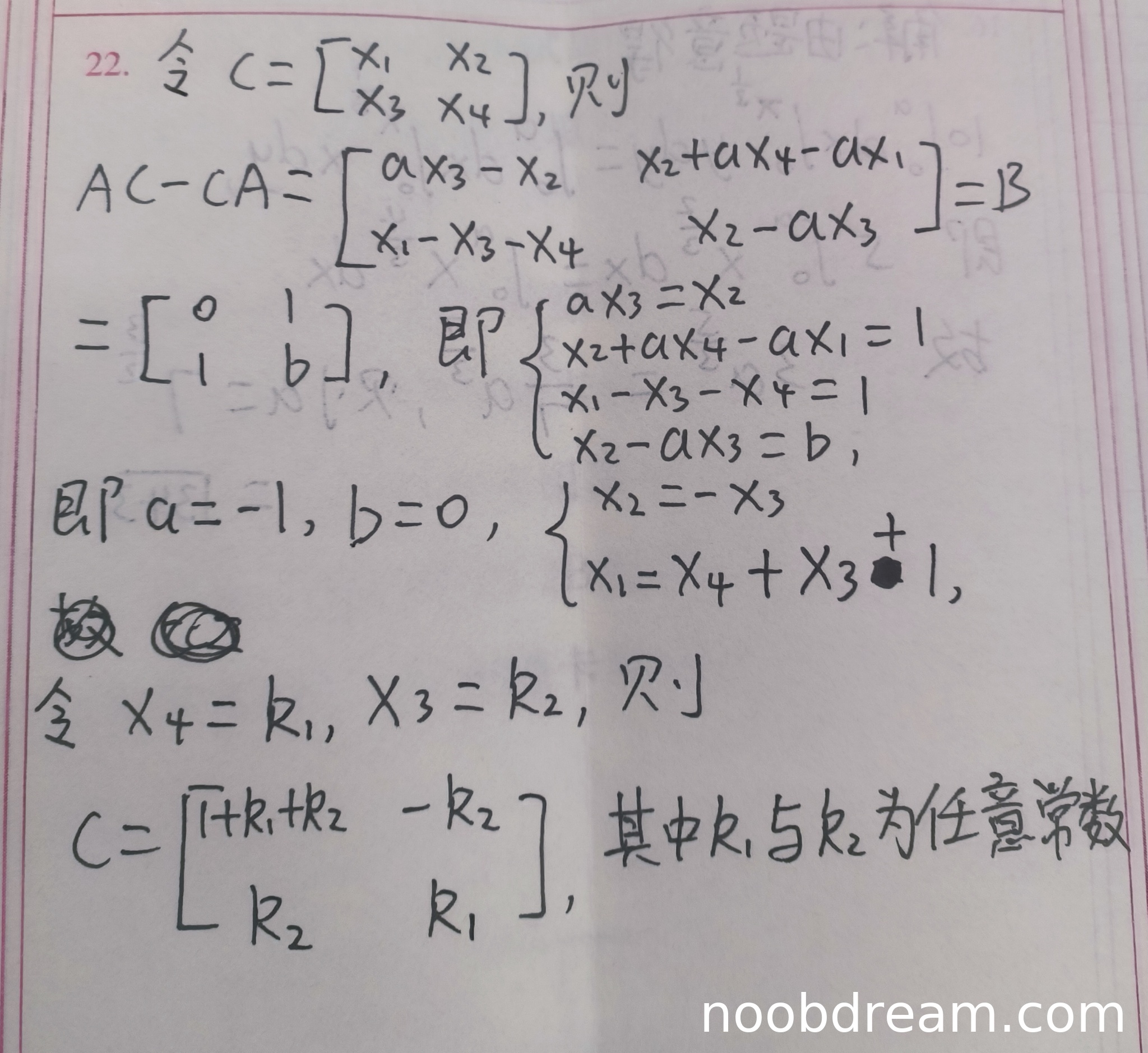 学生正确设出矩阵C的形式,并正确计算了AC-CA,得到四个方程。在求解过程中,学生直接得出a=-1, b=0,但缺少详细的线性方程组求解过程,没有展示增广矩阵的化简步骤。不过最终得到的参数条件是正确的。