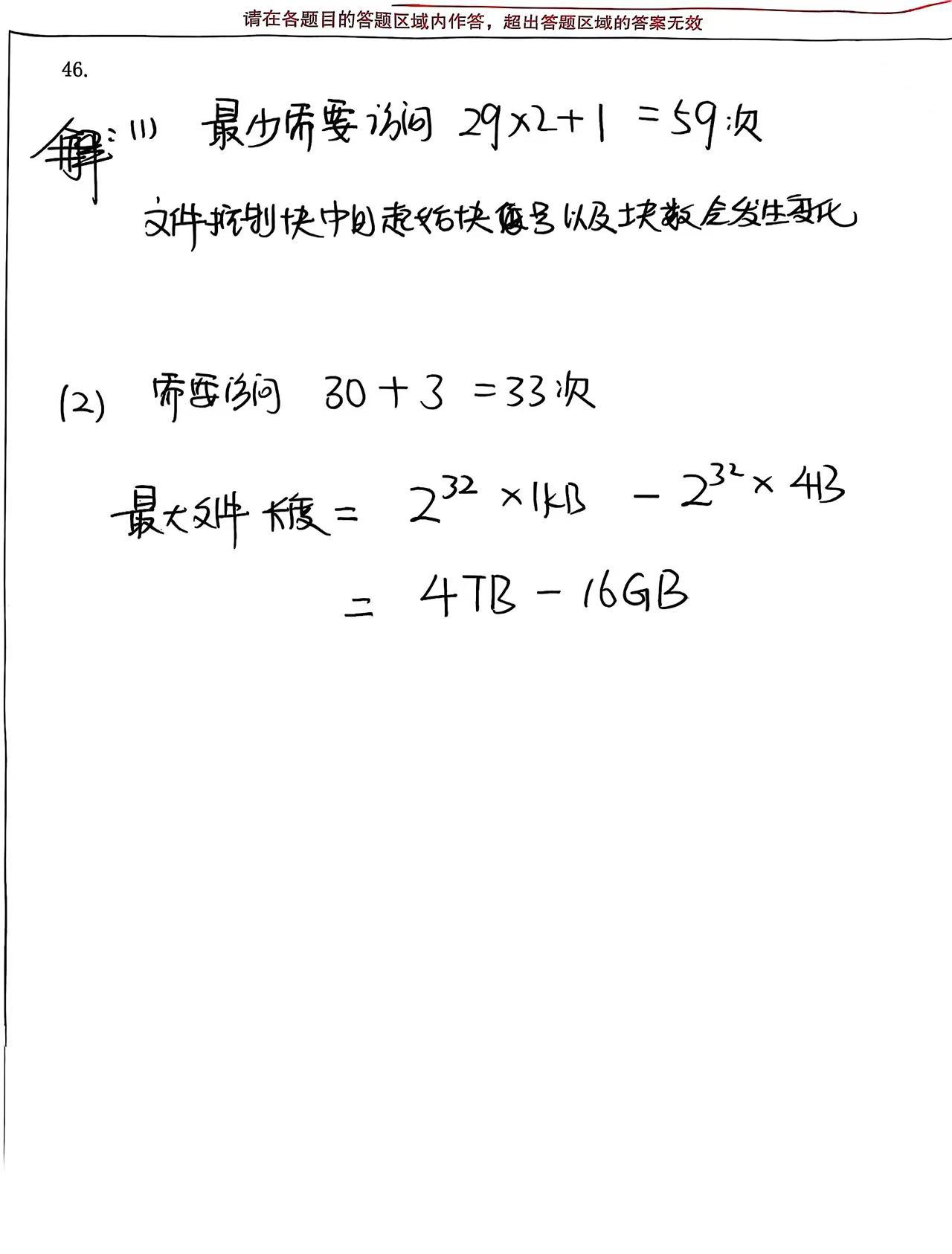 最大文件长度计算中,学生公式2³²×1KB-2³²×4B思路正确,但计算结果4TB-16GB错误。正确计算应为:2³²×(1024-4)B = 4G×1020B = 4080GB。学生计算错误,扣1分,得1分。本小题共得2分。