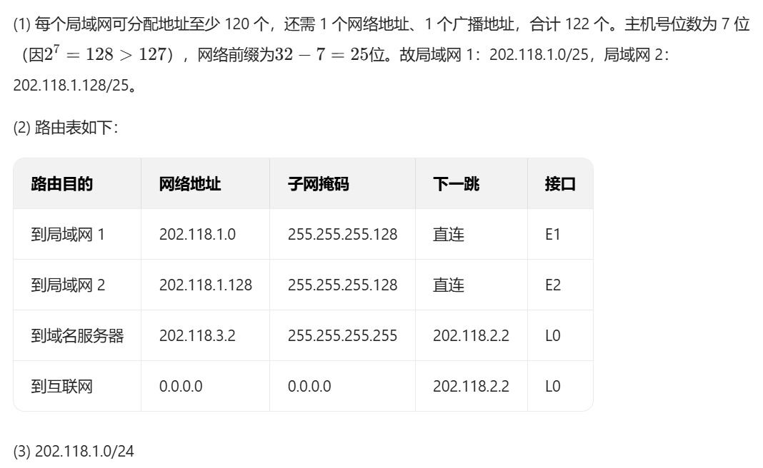 学生正确计算了主机号位数(7位)和网络前缀(25位),并给出了正确的子网划分结果:202.118.1.0/25 和 202.118.1.128/25。虽然学生提到“还需1个网络地址、1个广播地址,合计122个”,这个表述在CIDR中并不完全准确(因为全0和全1的主机地址在CIDR中通常可用),但核心计算和划分结果正确,不影响得分。因此得3分。