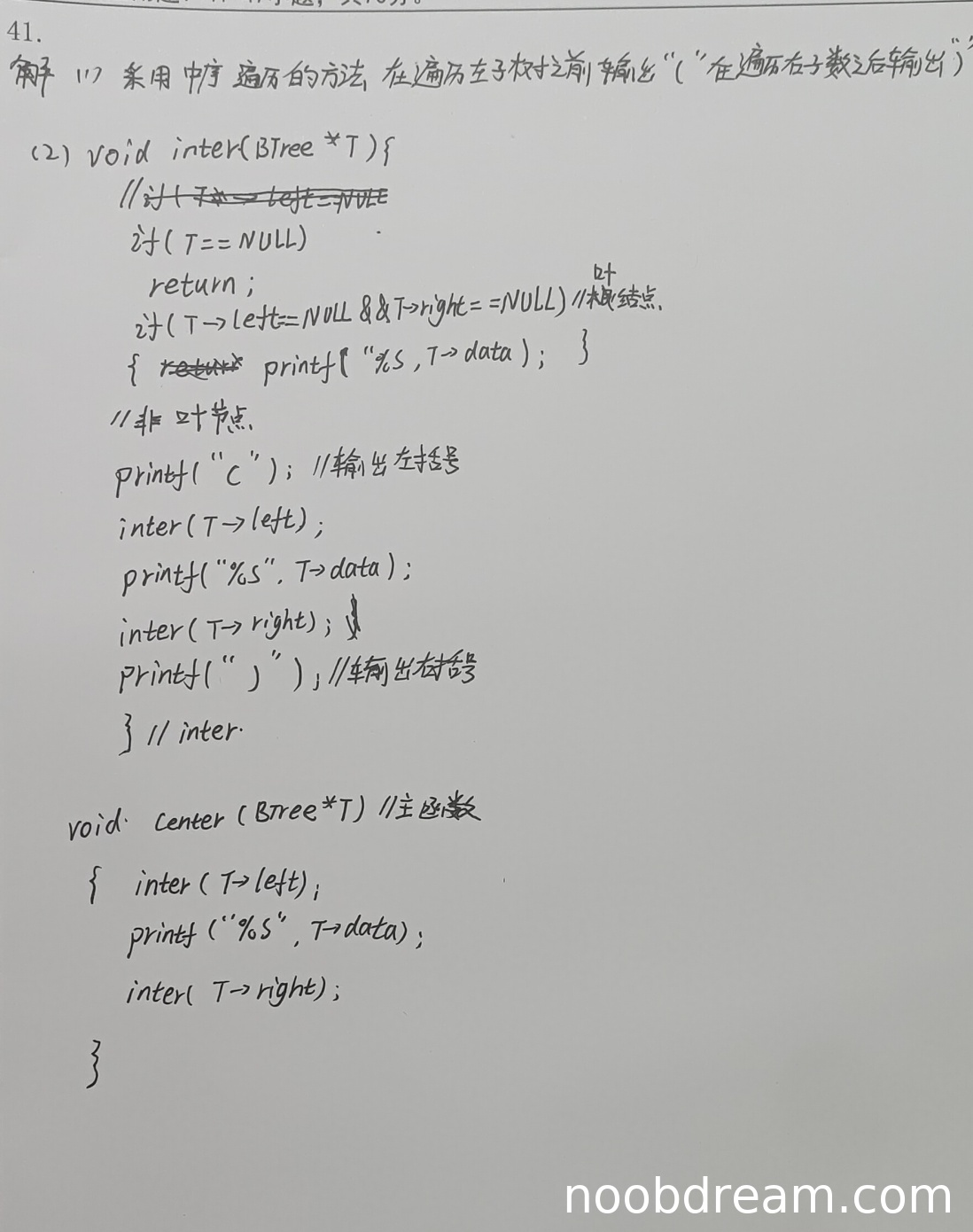 1. 主函数center中直接对左右子树调用inter函数,没有处理根节点的情况