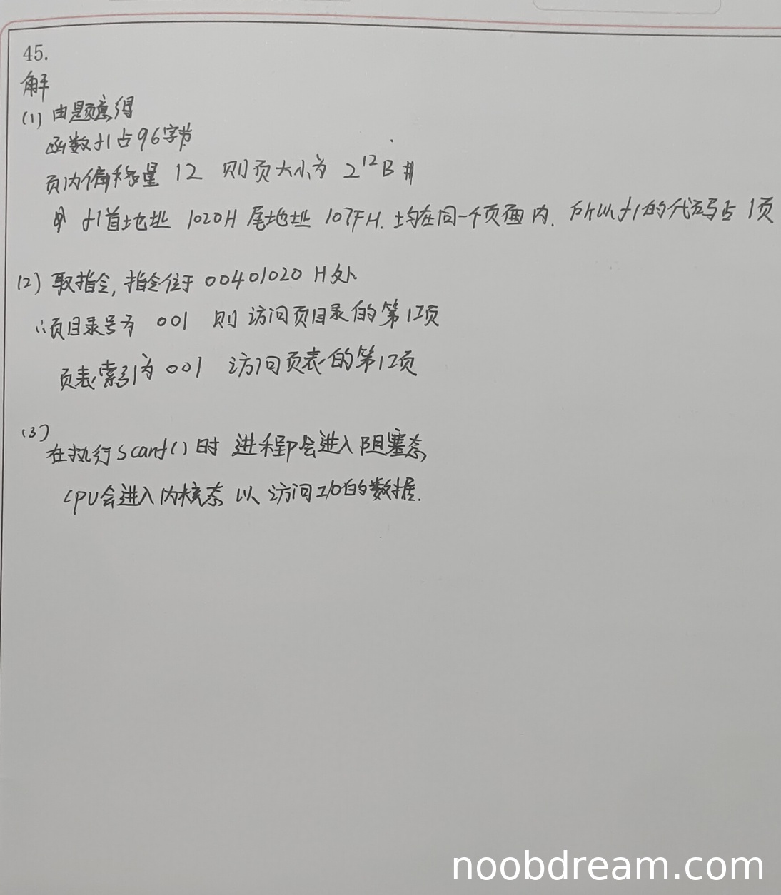 学生答案正确指出函数f1的机器指令代码占1页,理由充分(首地址1020H,尾地址107FH在同一页面内)。得1分。