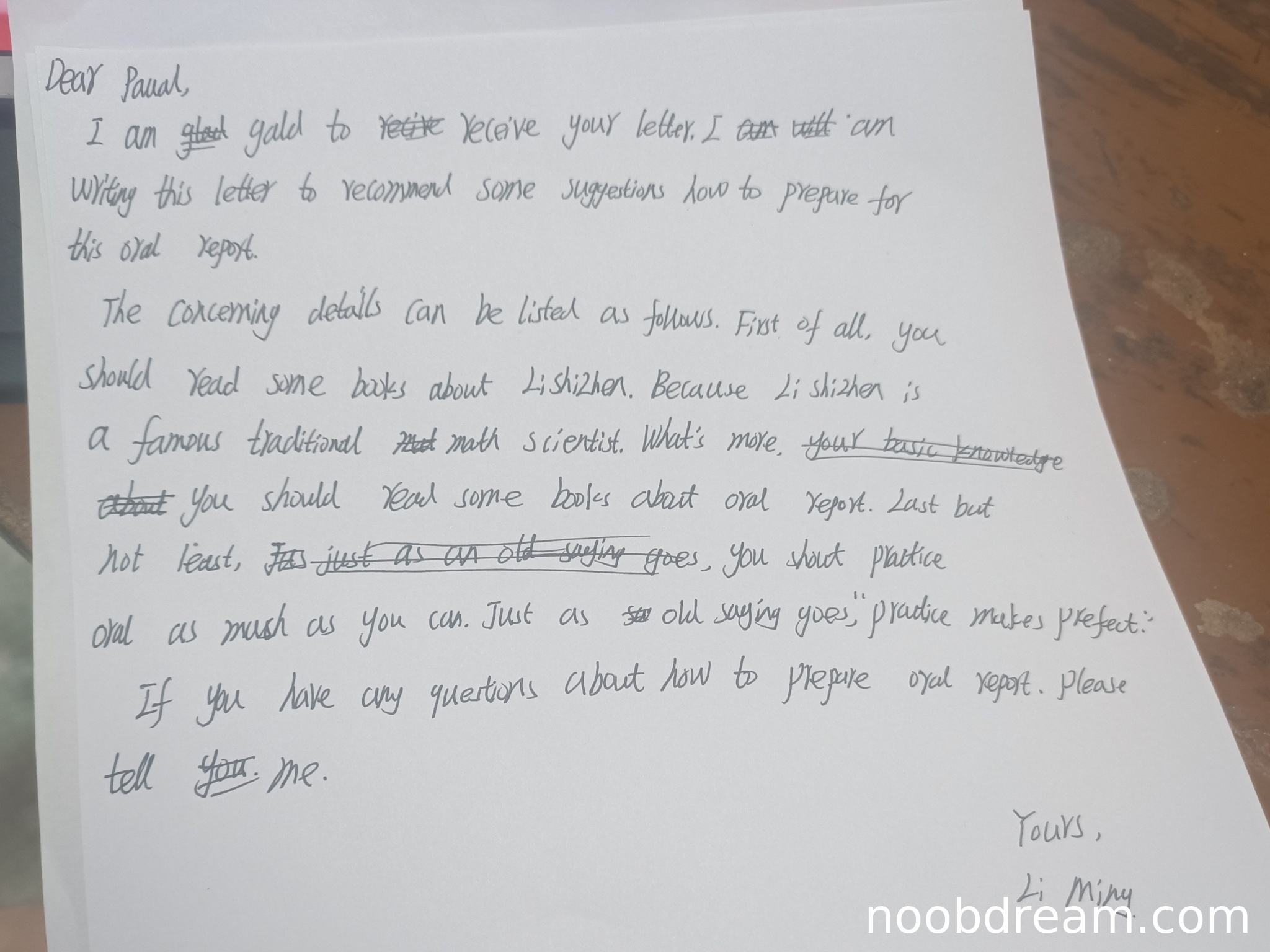 理由:格式基本正确,包含称呼、正文、结束语和签名。逻辑结构清晰,使用"First of all, What's more, Last but not least"等衔接词。但语域稍显正式与口语化混合,且建议的逻辑性有待加强(如阅读口头报告书籍的建议不够具体)。