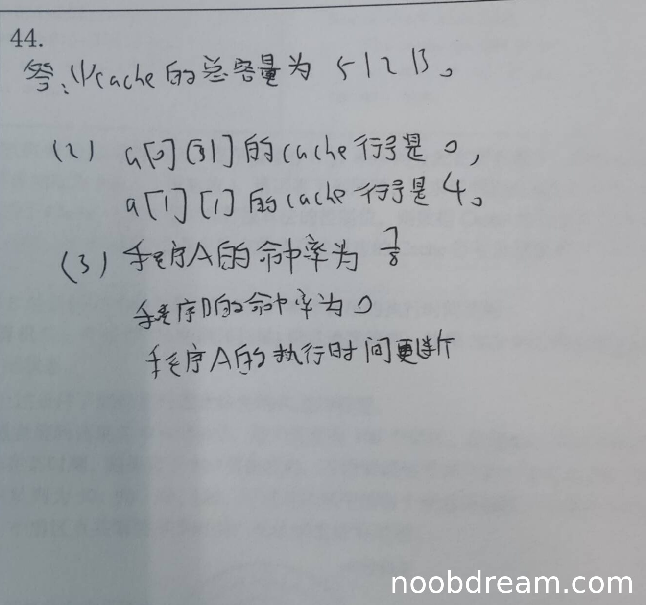 学生答案:程序A的命中率为7/8,程序B的命中率为0,程序A的执行时间更短。