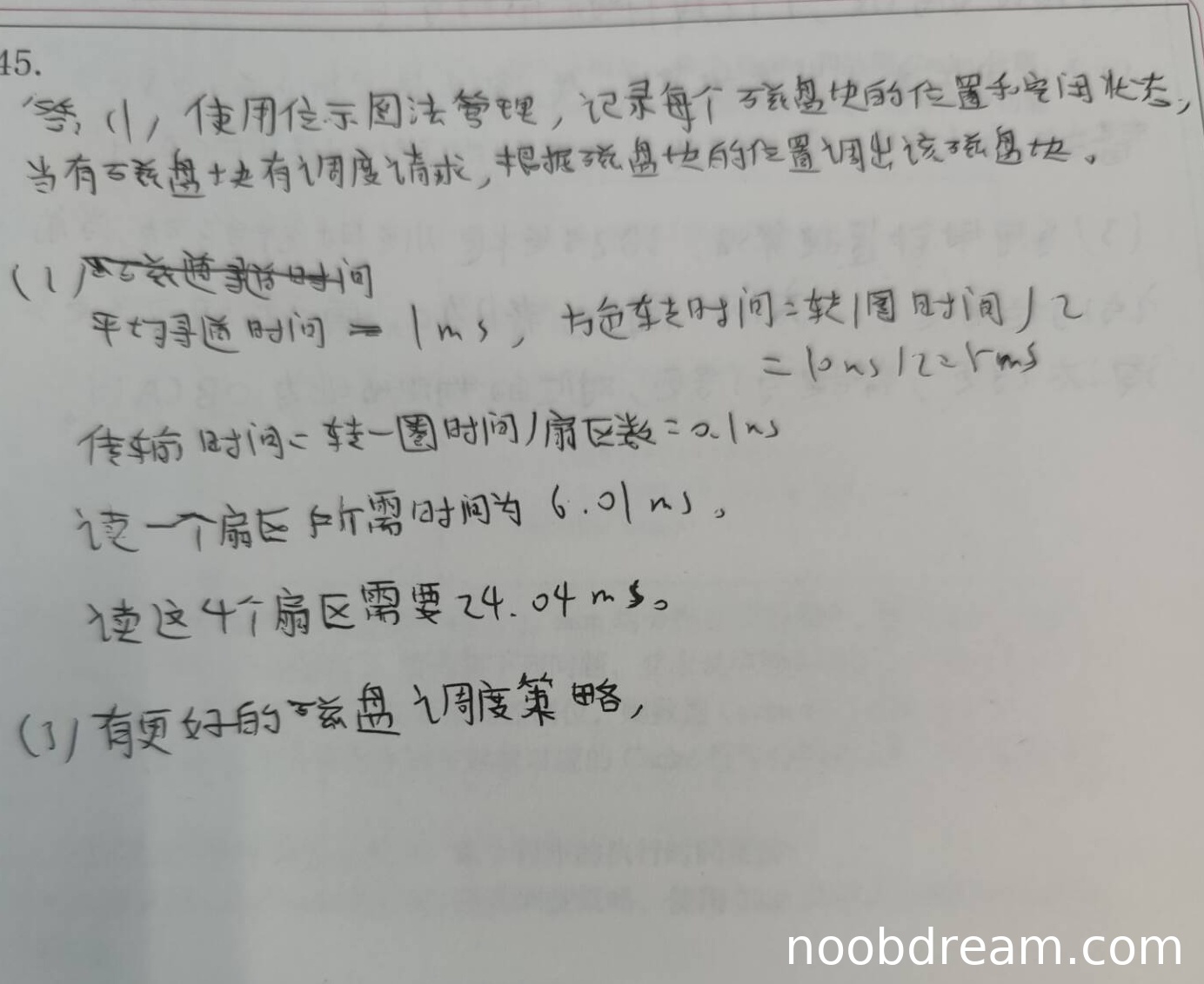 学生答案错误地计算了寻道时间、旋转延迟和传输时间,且未考虑CSCAN调度算法的具体移动顺序和移动距离。计算过程与标准答案完全不符,逻辑错误严重。因此扣3分。得分:0分。