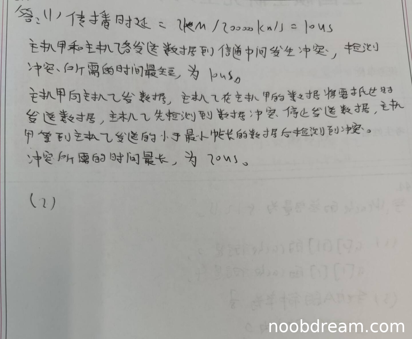 学生答案中,最短冲突检测时间10μs和最长冲突检测时间20μs的计算结果正确,单位换算正确(10μs = 0.01ms,20μs = 0.02ms)。对最短时间的解释"主机甲和主机乙各发送数据到信道中间发生冲突"基本正确,对最长时间的描述"主机甲向主机乙发数据,主机乙在主机甲的数据将要抵达时发送数据"也正确反映了最坏情况。虽然表述不如标准答案严谨,但核心逻辑正确。得4分。