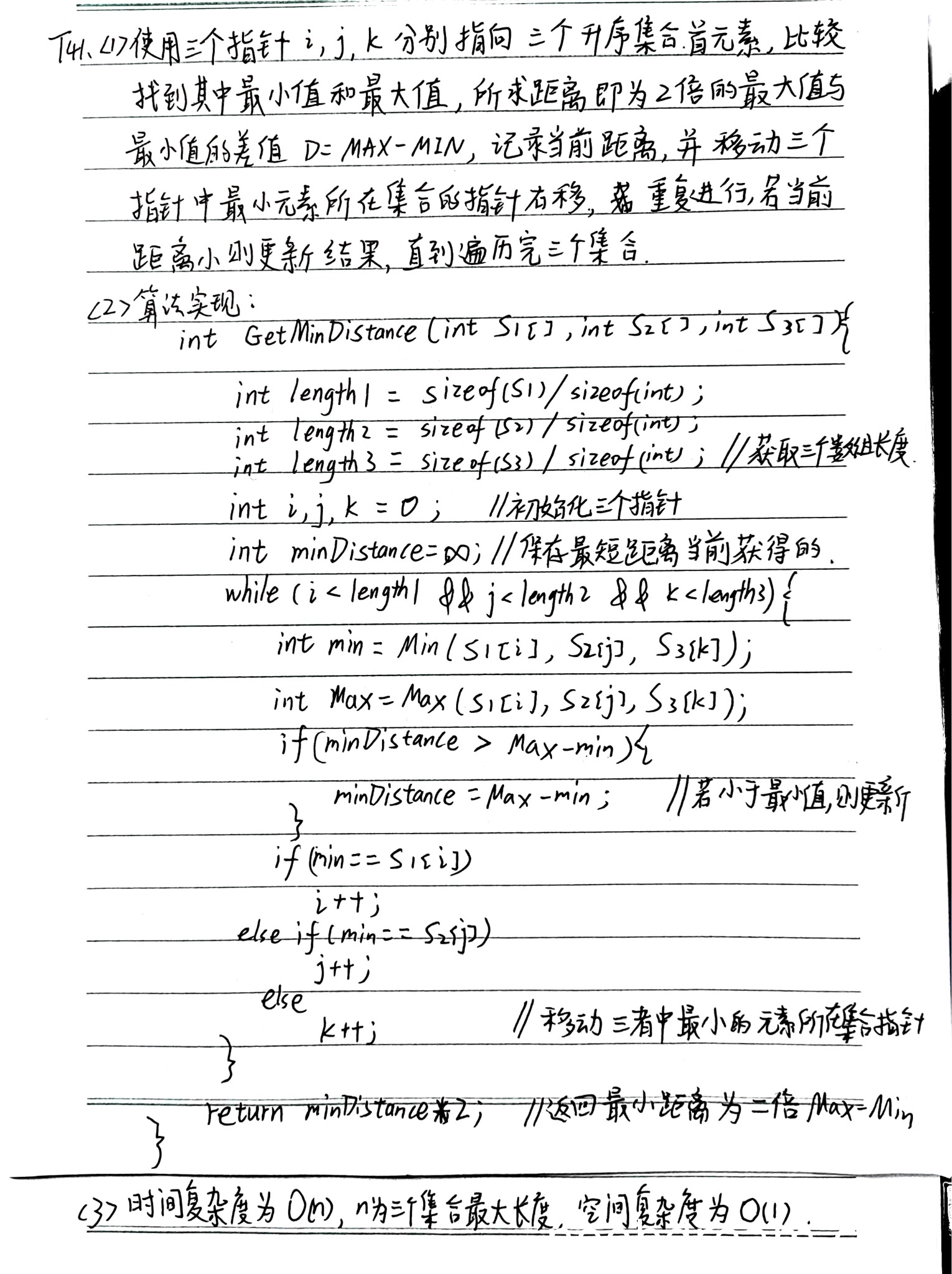 理由:学生的基本设计思想正确,采用了三指针方法,通过移动最小值的指针来遍历数组,这个思路与标准答案中的高效方法一致。但是学生错误地将距离简化为2*(Max-Min),实际上题目定义的距离是|a-b|+|b-c|+|c-a|,这个表达式在三个数不全相等时并不等于2*(Max-Min)。不过核心的指针移动策略是正确的。