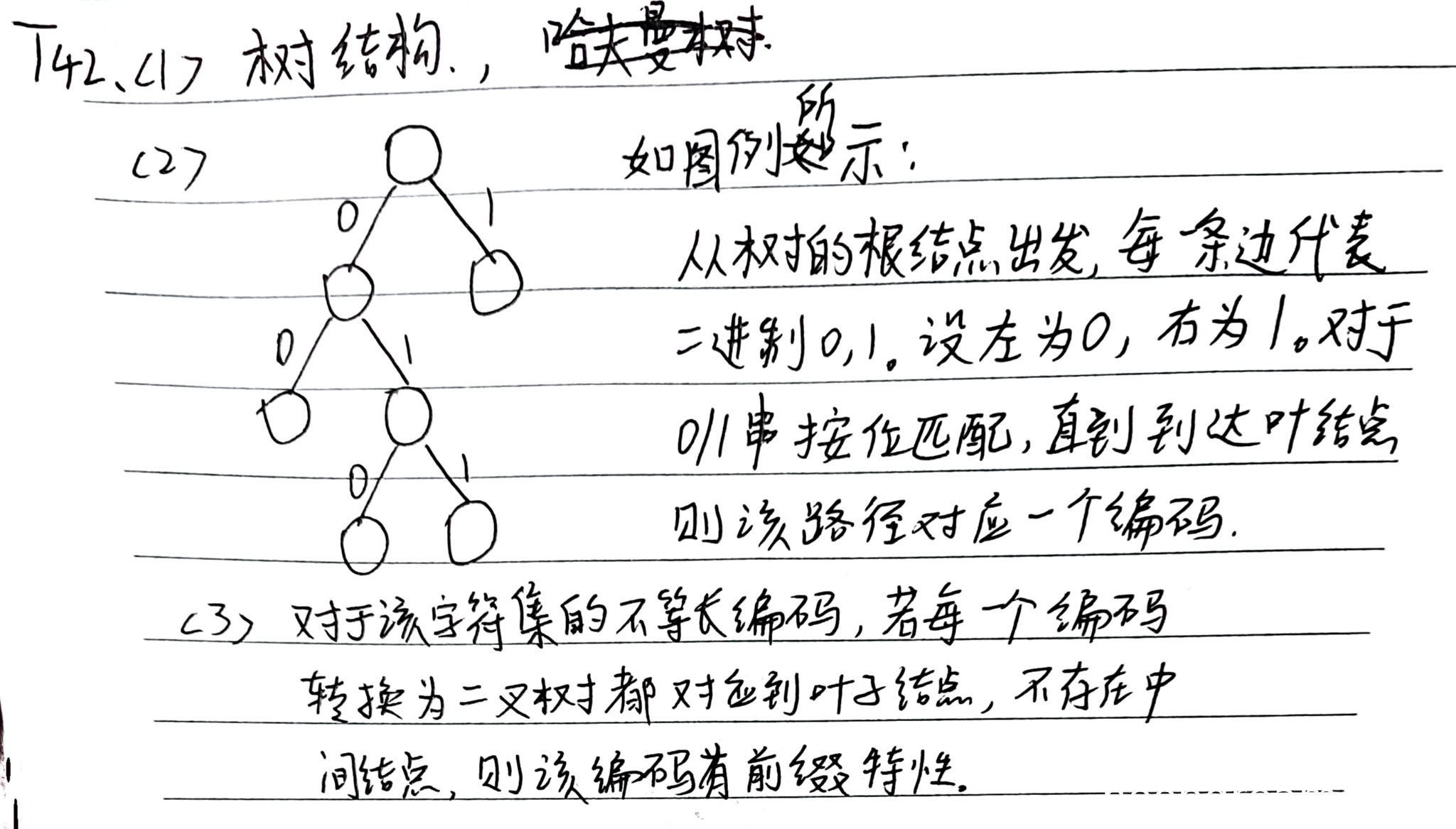 学生指出“每一个编码转换为二叉树都对应到叶子结点,不存在中间结点”,这准确反映了前缀特性的判定条件:字符编码必须对应二叉树的叶结点,不能是内部结点。标准答案中“字符信息只能存在叶结点中”与此等价。因此,该部分回答正确,得3分。