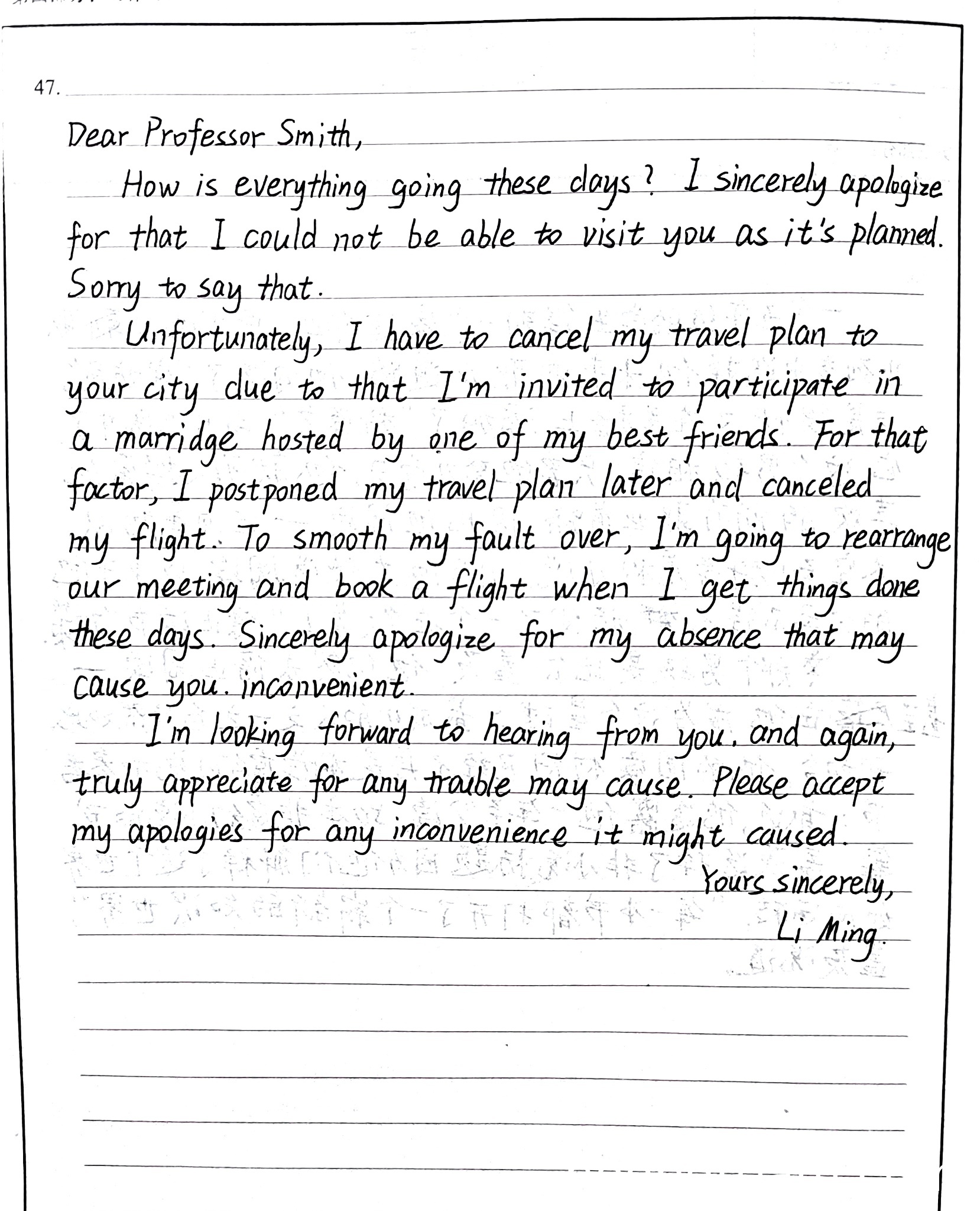 理由:虽然邮件格式基本正确(称呼、结尾、签名完整),但语域把握不当。文中出现"How is everything going"这样过于随意的问候语,以及"Sorry to say that"等口语化表达,与给教授的正式邮件不符。同时多次重复道歉显得不够简洁得体。