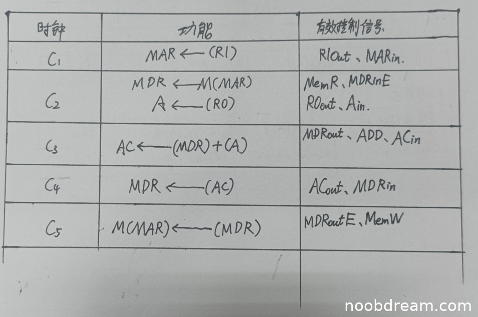 学生作答与标准答案中的参考答案一基本一致,主要差异在于节拍编号从C5开始变成了从C1开始。根据题目要求,执行阶段应该接在取指和译码阶段之后,原题中取指和译码阶段已经使用了C1-C4,因此执行阶段应该从C5开始。但考虑到学生可能是重新编号,且功能和控制信号的逻辑顺序完全正确,这属于编号方式不同但不影响逻辑正确性。