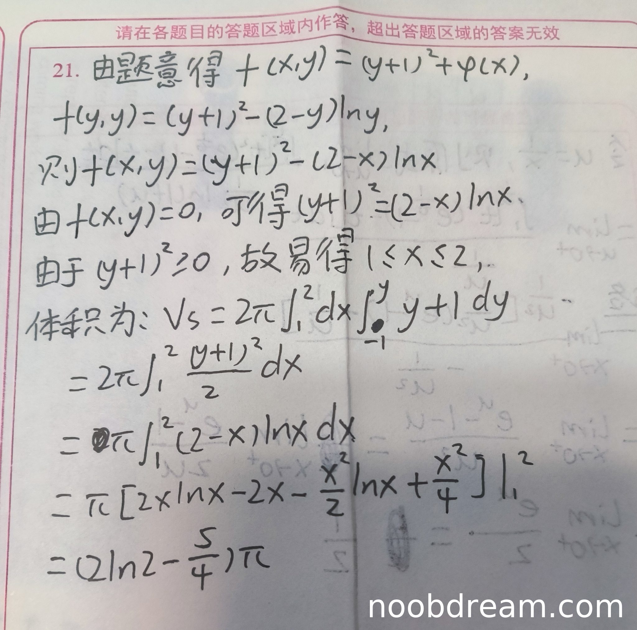 不过,学生后续的计算过程是正确的:从 2π∫₁²[(y+1)²/2]dx 到 π∫₁²(2-x)ln x dx,最终积分结果正确得到 π(2ln2-5/4)。