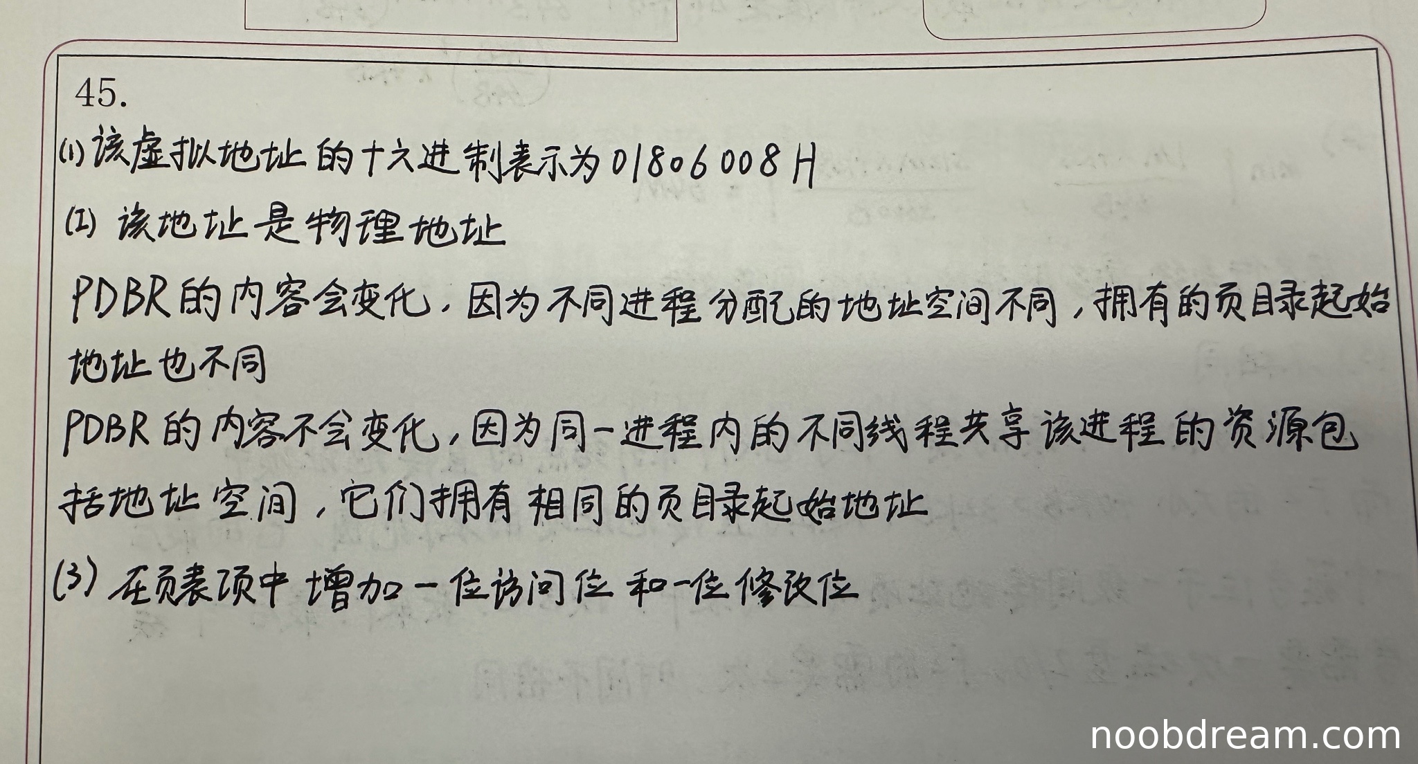 第二问:学生回答"PDBR的内容会变化,因为不同进程分配的地址空间不同,拥有的页目录起始地址也不同",理由正确。得1分。