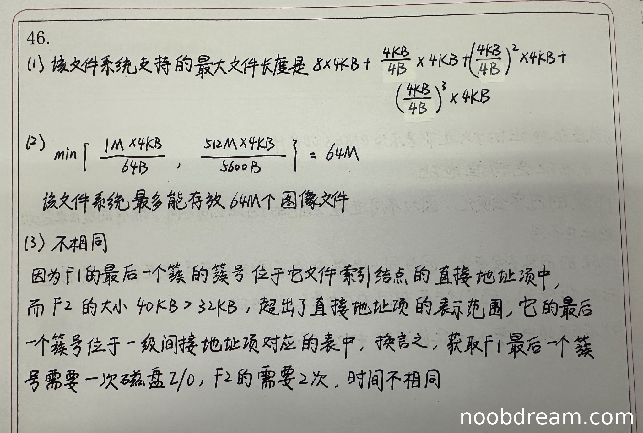 学生答案给出了min[ (1M×4KB)/64B, (512M×4KB)/5600B ] = 64M,并得出结论最多能存放64M个图像文件。这个计算过程正确考虑了索引节点数量和数据簇数量的限制,并取最小值,与标准答案一致。虽然表达式中的括号和分数形式略有差异,但计算逻辑正确,因此得满分2分。