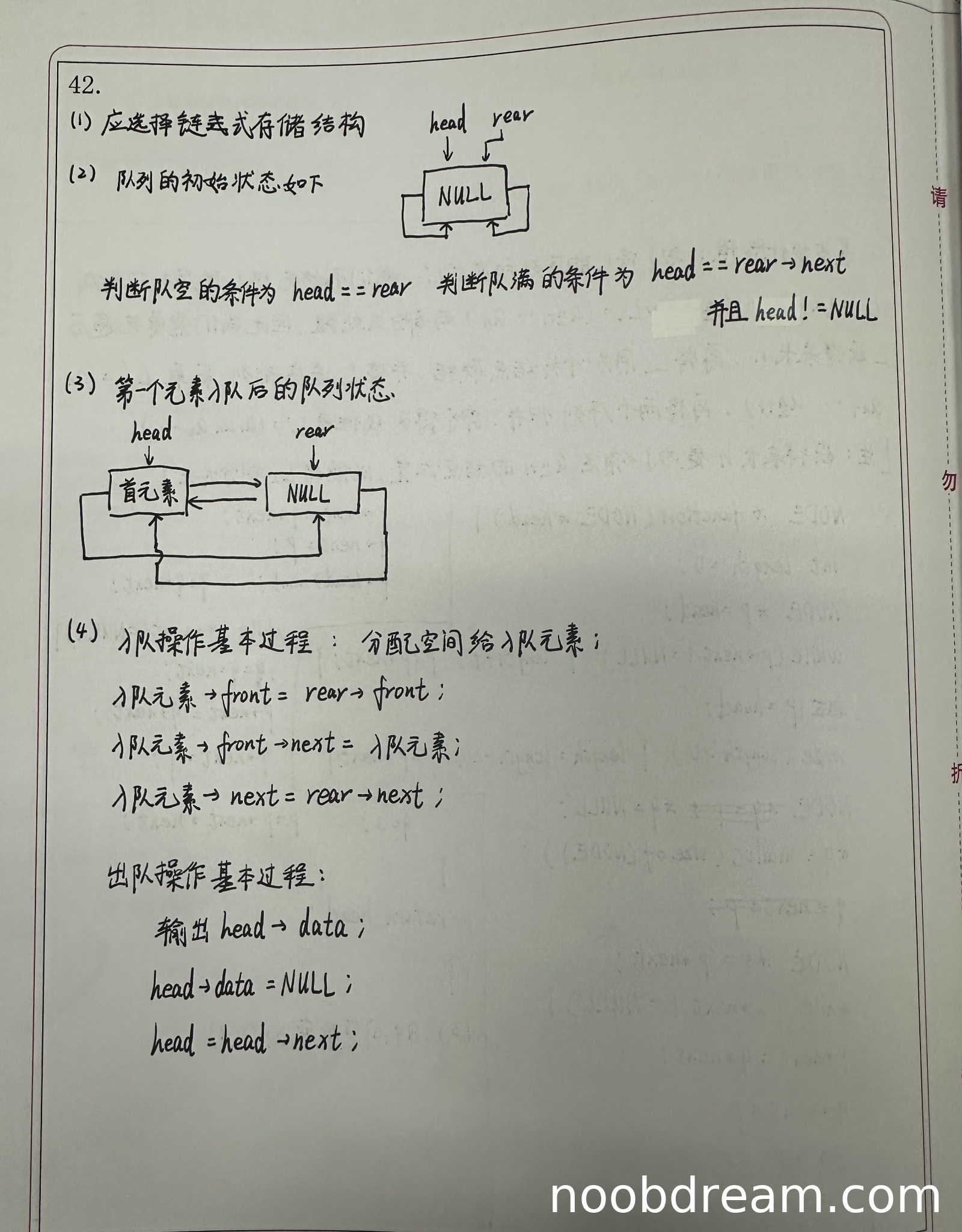 学生描述"head指向首元素,rear指向NULL"存在逻辑错误: