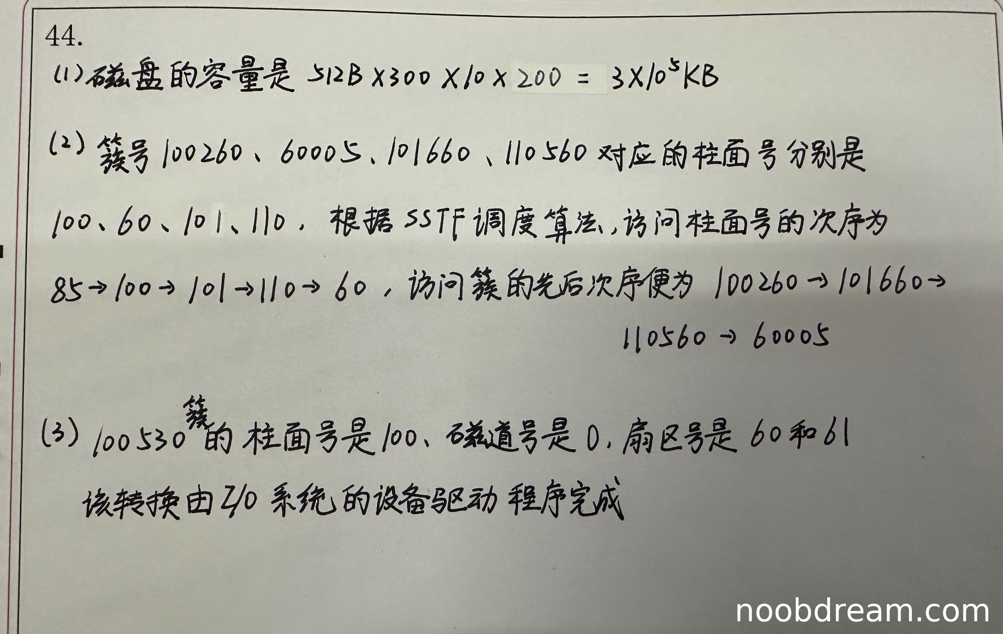 学生正确计算了各簇对应的柱面号(100、60、101、110),并基于SSTF算法给出了正确的访问顺序(100→101→110→60),与标准答案一致。得2分。