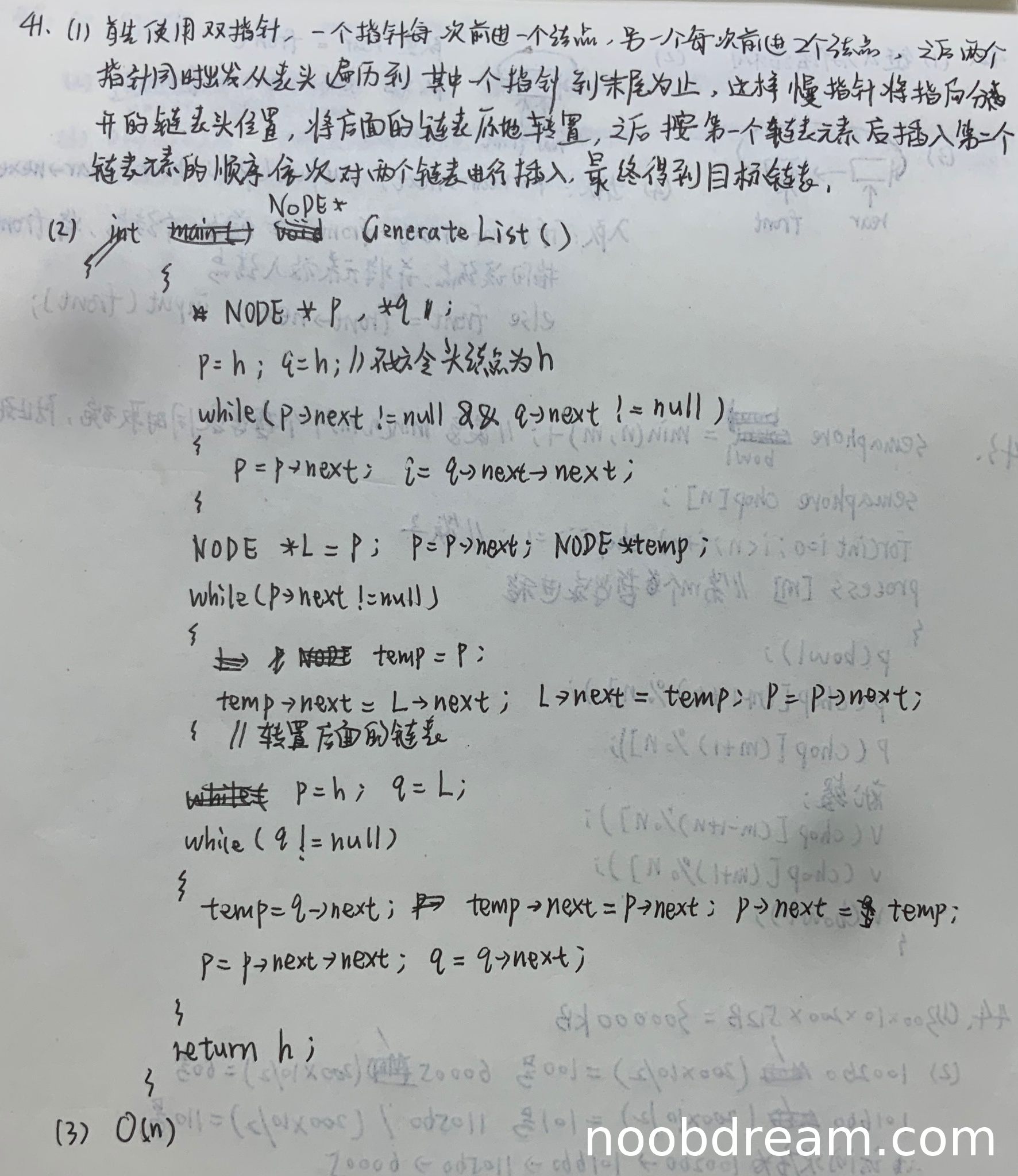 1. 快慢指针初始条件错误:标准答案中快慢指针应从head开始,学生代码中P和q都初始化为h(头结点),但后续直接进入循环移动,没有先指向第一个实际结点。