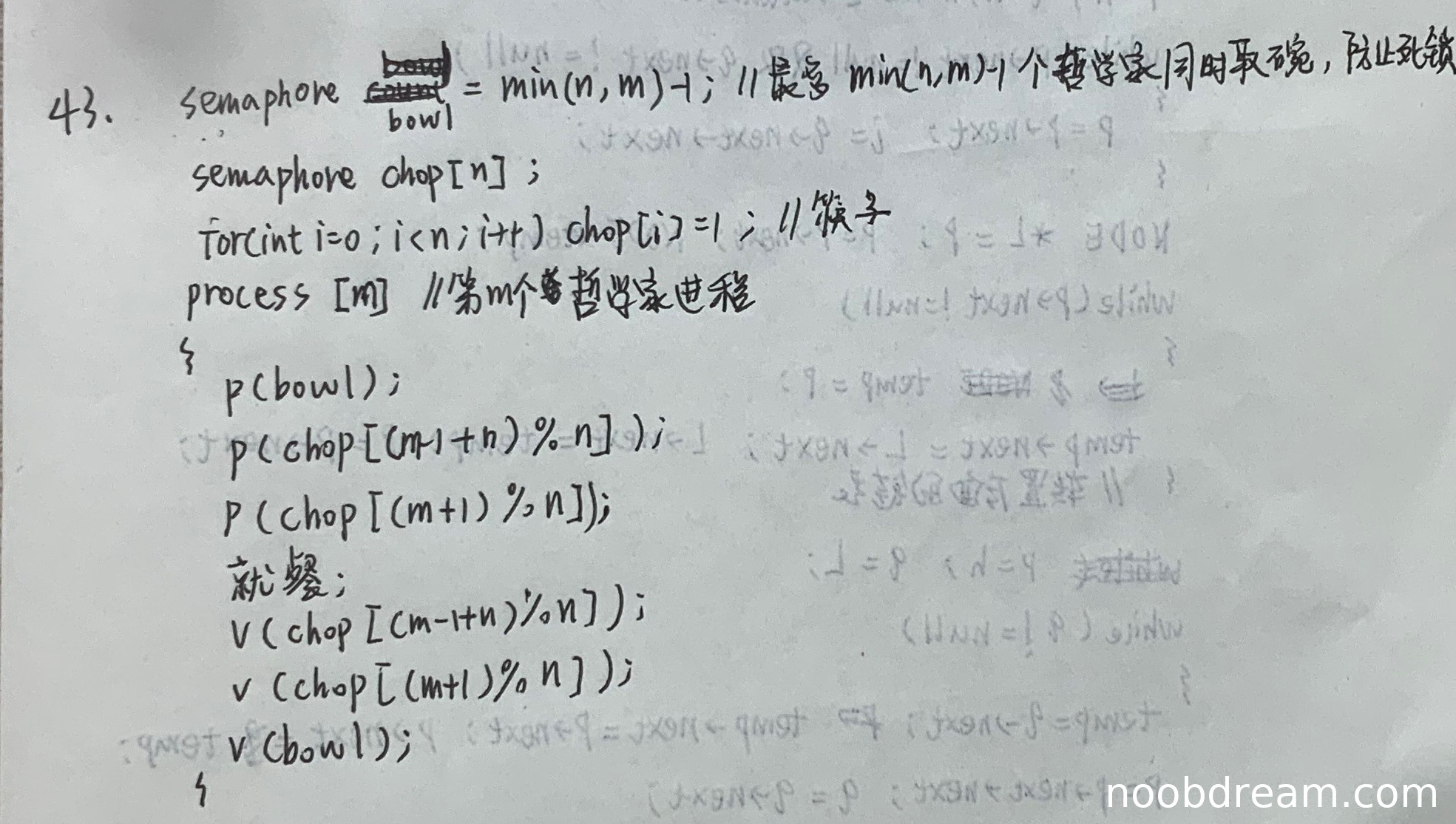 学生答案中碗信号量设置为 min(n, m) - 1,这与标准答案的 min(n-1, m) 不同。标准答案中 n-1 是因为最多只能有 n-1 个哲学家同时进餐(避免死锁),而学生的 min(n, m) - 1 在 n ≤ m 时会比标准答案少1个名额,限制了并发度。这是一个逻辑错误,扣2分。得2分。