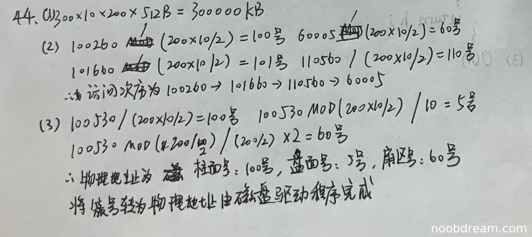 标准答案:柱面号100、磁道号5、扇区号60;磁盘驱动程序