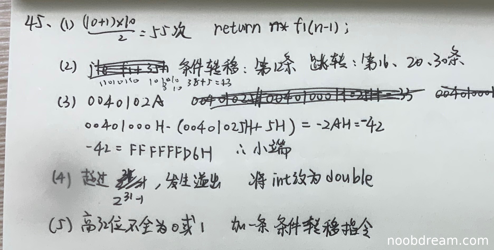 第一问:学生回答计算f(10)需要调用函数f1 55次,这是错误的。正确的调用次数应为10次,因为每次递归调用参数n减1,从10到1共10次。第二问:学生回答执行"return n*f1(n-1);"会递归调用f1,这是正确的,对应第16行的call指令。因此第一问扣1分,第二问得1分,本小题得1分。