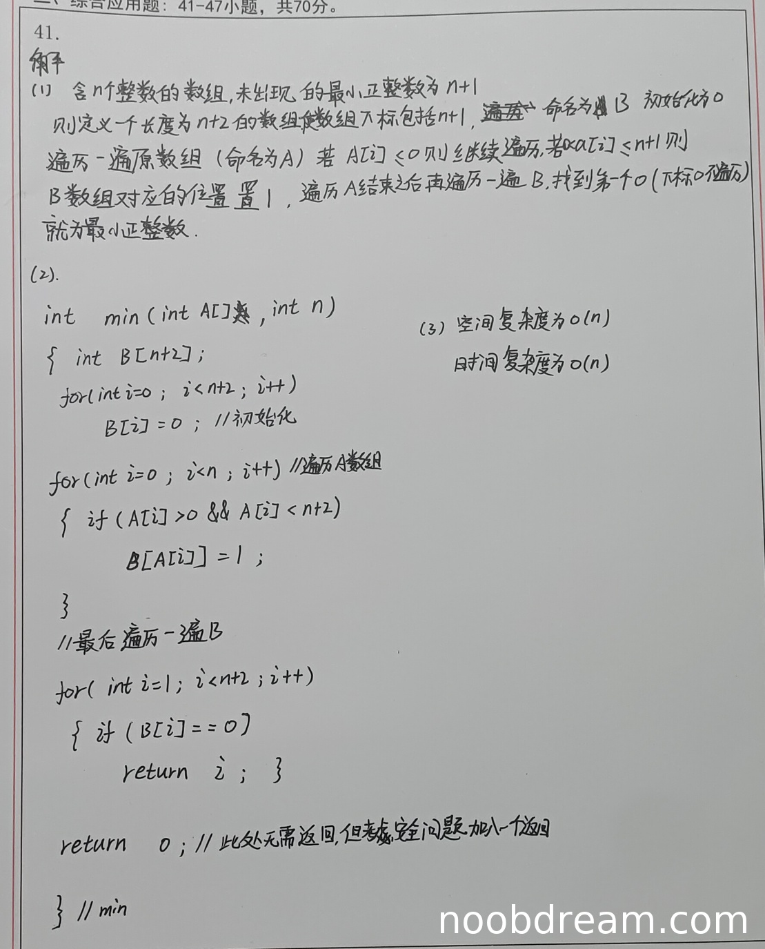 学生答案的基本设计思想是使用一个辅助数组B来标记出现过的正整数,然后遍历B找到第一个未标记的位置作为结果。这种方法与标准答案的"负号标记"方法不同,但思路正确且能够解决问题。虽然使用了额外的O(n)空间,但题目要求"时间上尽可能高效",并未限制空间使用,因此该思路正确。得3分。