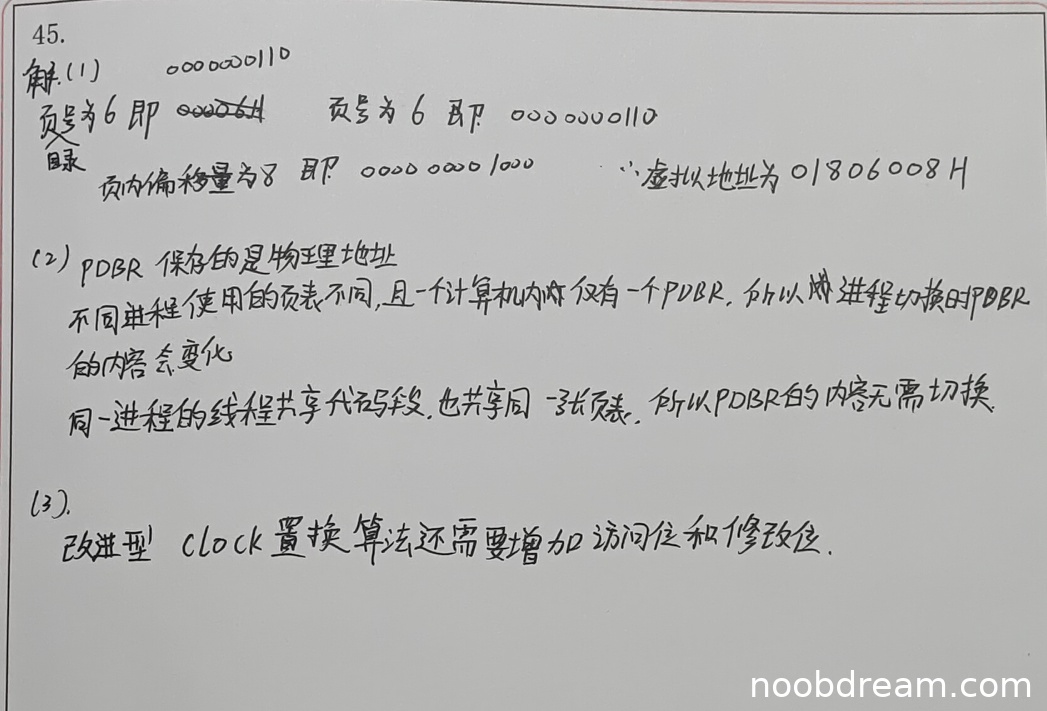 第二问:学生正确说明进程切换时PDBR内容会变化,理由基本正确(不同进程使用不同页表),得1分。