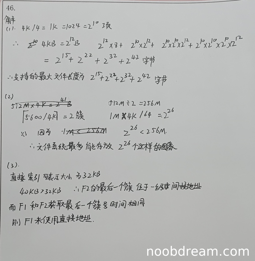 学生正确计算了文件数据簇能存放的文件数(256M)和索引节点总数(2²⁶=64M),并得出最终结果为2²⁶个文件。虽然表达式中"1M×4K/164"中的"164"应为"64B",但根据上下文判断为识别错误,实际计算结果是正确的。最终结论正确,得2分。