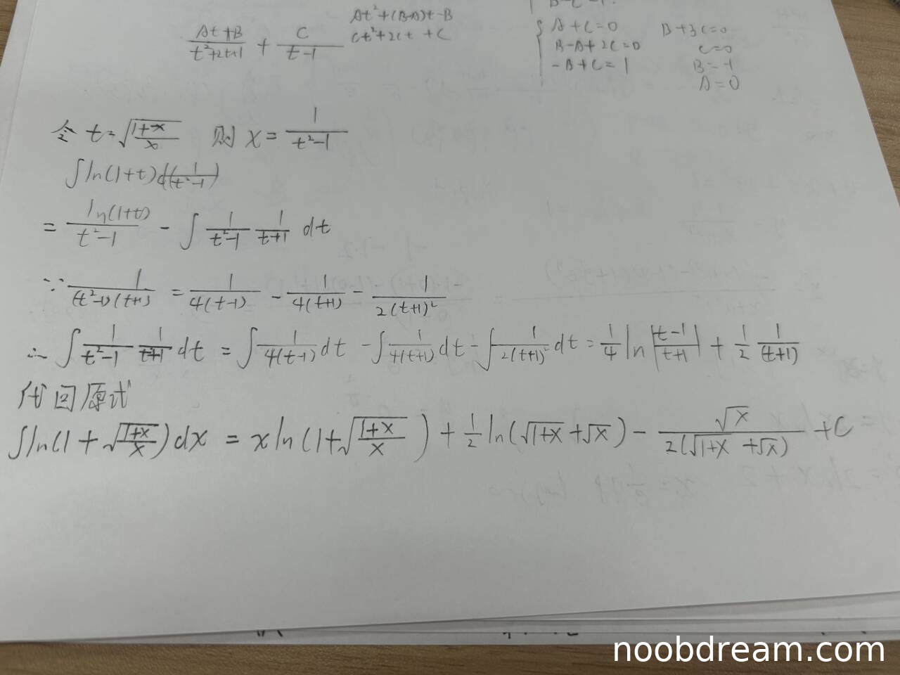 学生正确进行了部分分式分解:\( \frac{1}{(t^2-1)(t+1)} = \frac{1}{4(t-1)} - \frac{1}{4(t+1)} - \frac{1}{2(t+1)^2} \),并正确积分得到 \( \frac{1}{4}\ln\left|\frac{t-1}{t+1}\right| + \frac{1}{2(t+1)} \)。此步骤与标准答案等价(标准答案为 \( \frac{1}{4}\ln|t-1| - \frac{1}{4}\ln|t+1| + \frac{1}{2(t+1)} \)),得3分。