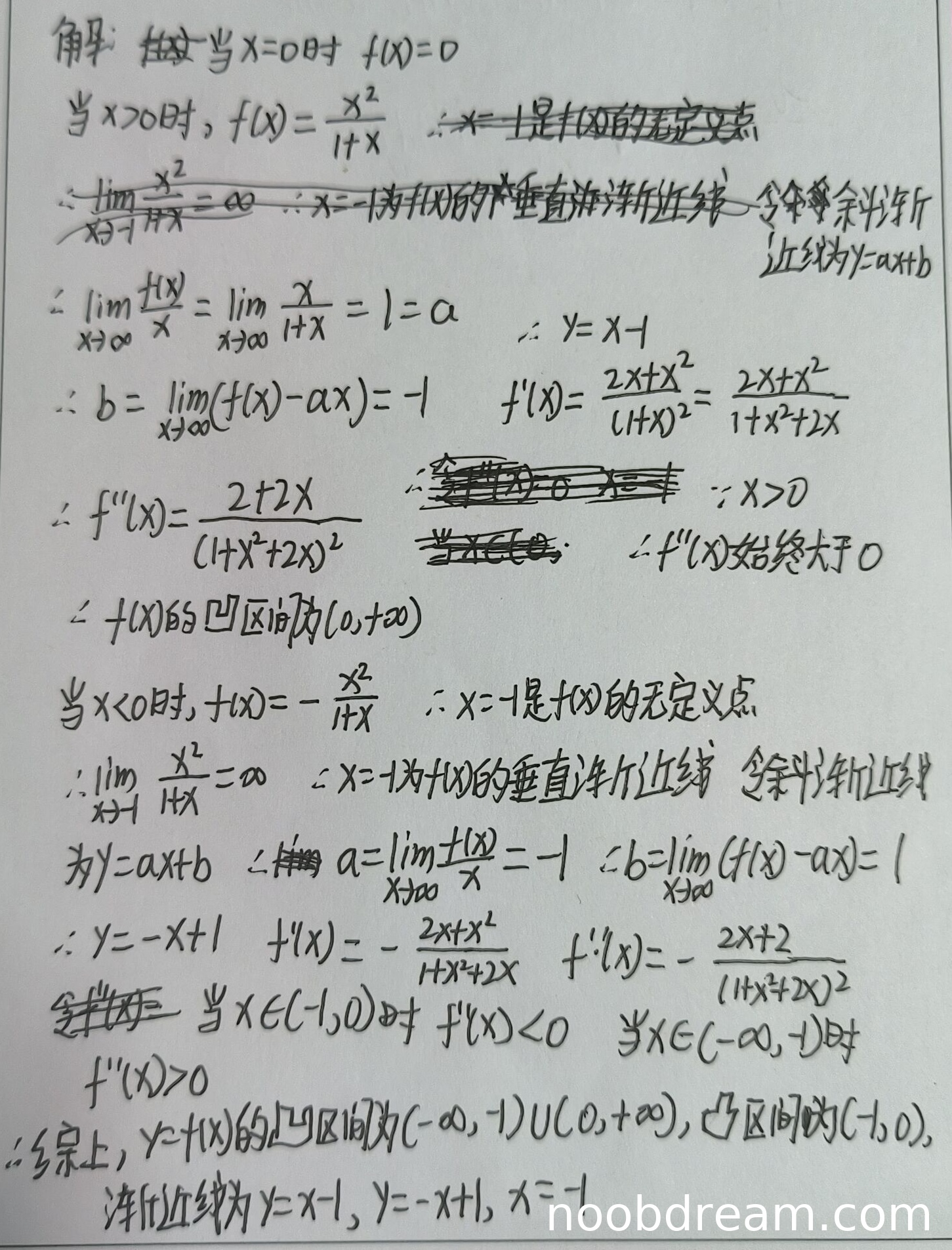 学生正确找出了所有渐近线:铅垂渐近线x=-1,斜渐近线y=x-1(x→+∞)和y=-x+1(x→-∞)。计算过程完整,极限计算正确,渐近线方程准确。