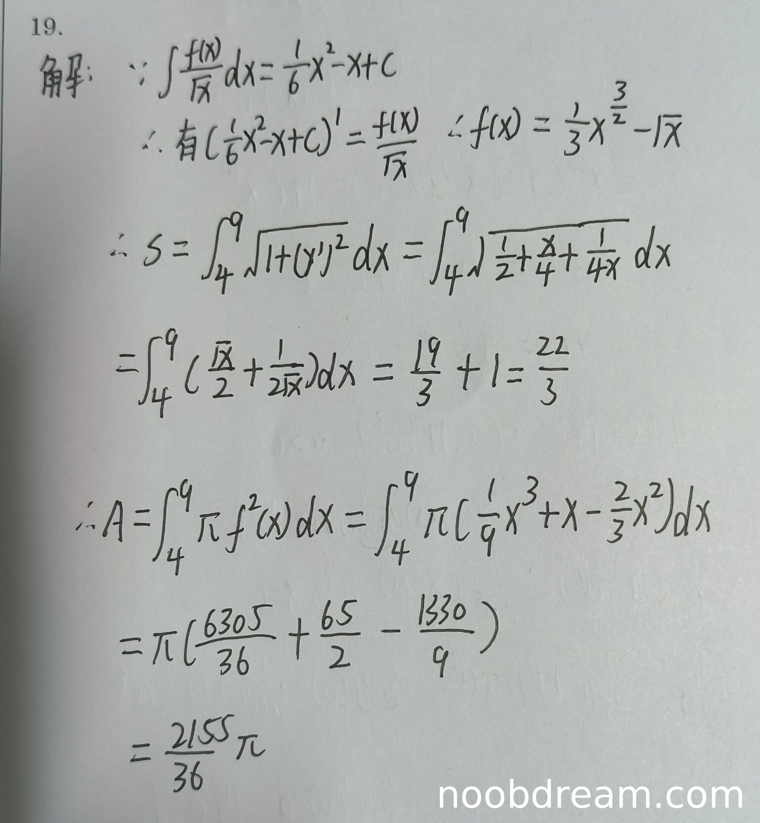 理由:学生正确计算了导数f'(x),准确推导出1+[f'(x)]²的表达式,并正确化简为(√x/2 + 1/(2√x))²。积分计算过程完整,代入上下限计算正确,得到S=22/3。思路和计算均与标准答案一致。