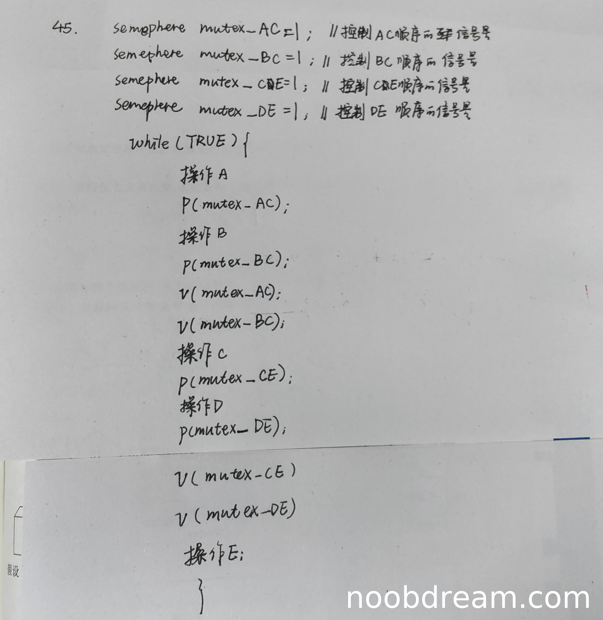 - 缺少必要的等待操作:操作C没有等待A和B完成的机制,操作E没有等待C和D完成的机制。