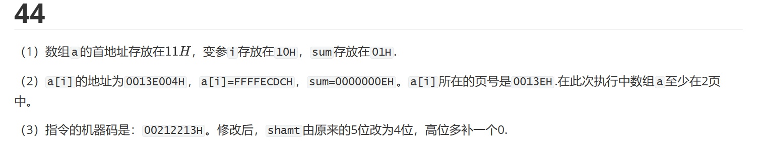 学生答案中指令机器码为00212213H,与标准答案一致;当数组a改为short类型时,学生答案指出shamt由5位改为4位,高位多补一个0,但未给出具体的汇编形式。标准答案为"slli r4, r2, 1",学生答案未明确写出汇编指令,属于不完整回答。但根据描述可推断出移位次数应为1,故扣1分。得1分。