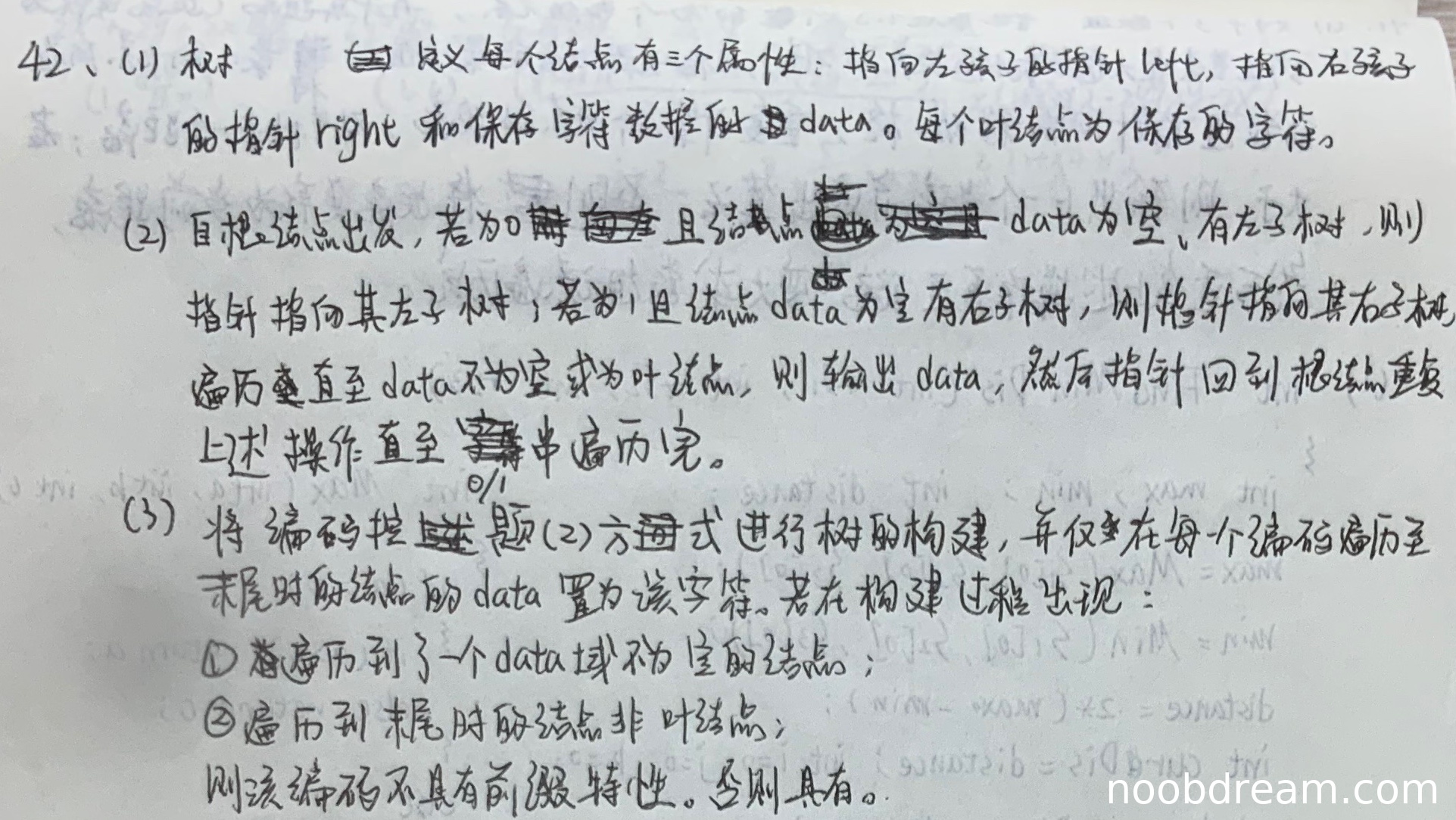 学生提出了通过构建树来判定前缀特性的方法,并指出两种违反前缀特性的情况:①遍历过程中遇到data不为空的结点(说明该结点已被某个字符编码占用,当前编码是此前缀的后缀);②遍历到末尾时结点非叶结点(说明当前编码是其他编码的前缀)。这两种情况的判断逻辑正确,与标准答案中“字符信息只能存在叶结点中”的思想一致。因此,得3分。