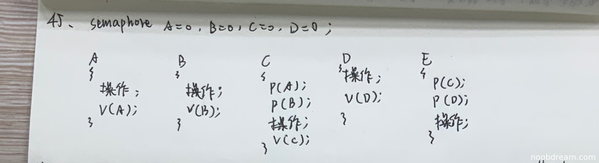 理由:操作C通过P(A)、P(B)等待A和B完成,完成后执行V(C)通知E,逻辑完全正确。由于信号量命名与标准答案不同但不影响功能,不扣分。