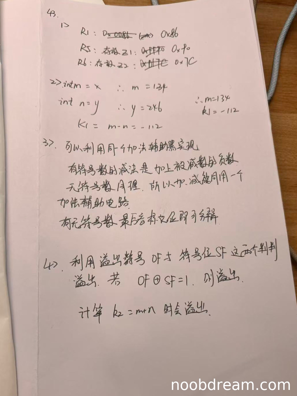学生提出用OF和SF异或判断溢出(OF ⊕ SF = 1),这是带符号整数溢出的判断方法之一(实际为OF标志位判断),思路正确;指出k2=m+n会溢出,与标准答案一致。但第一次识别中写为“R2=m+n”可能是识别错误,第二次识别未重复该错误,不影响得分。因此得3分。