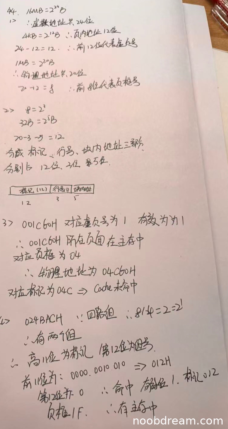 学生正确计算出虚拟地址24位、虚页号前12位,物理地址20位、页框号前8位,与标准答案一致。得4分。