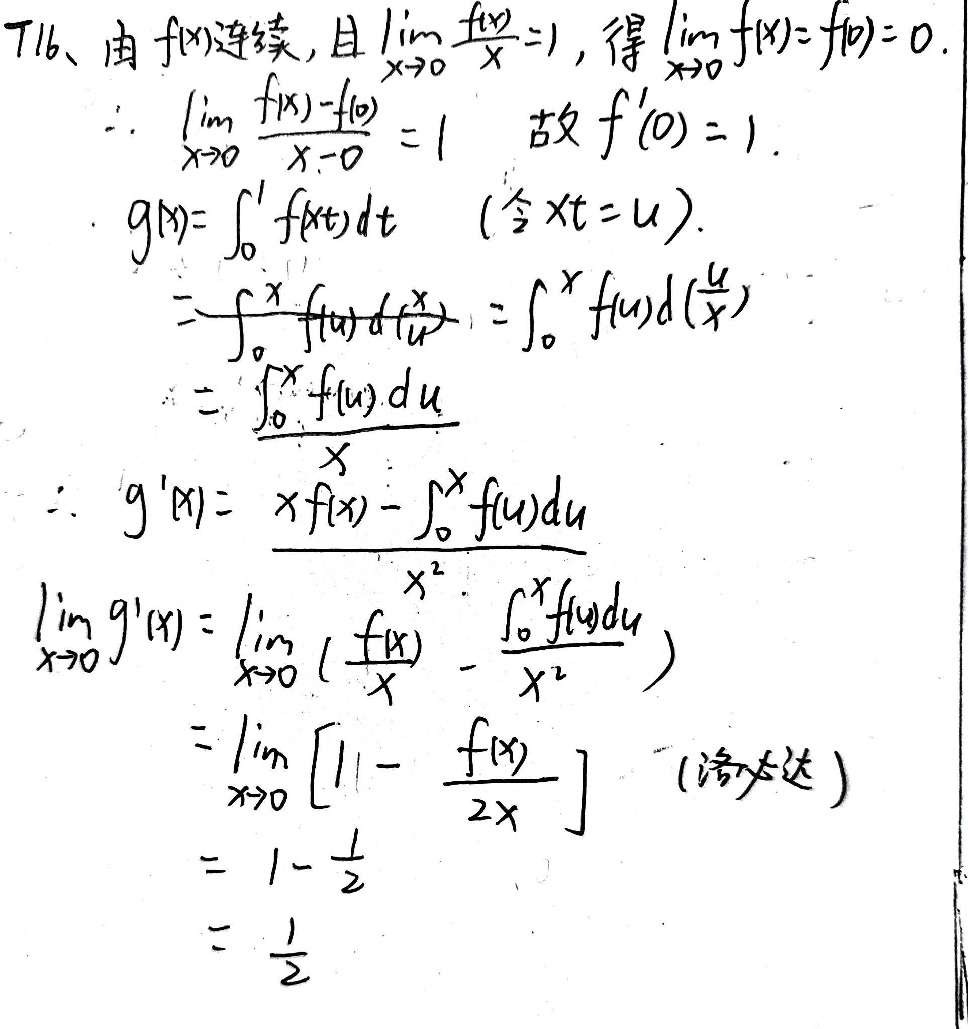 主要问题:学生没有明确给出g'(0)的值,也没有完整写出分段形式的g'(x),但在计算极限时隐含了g'(0)=1/2。由于是两次识别,取较好的一次评分。