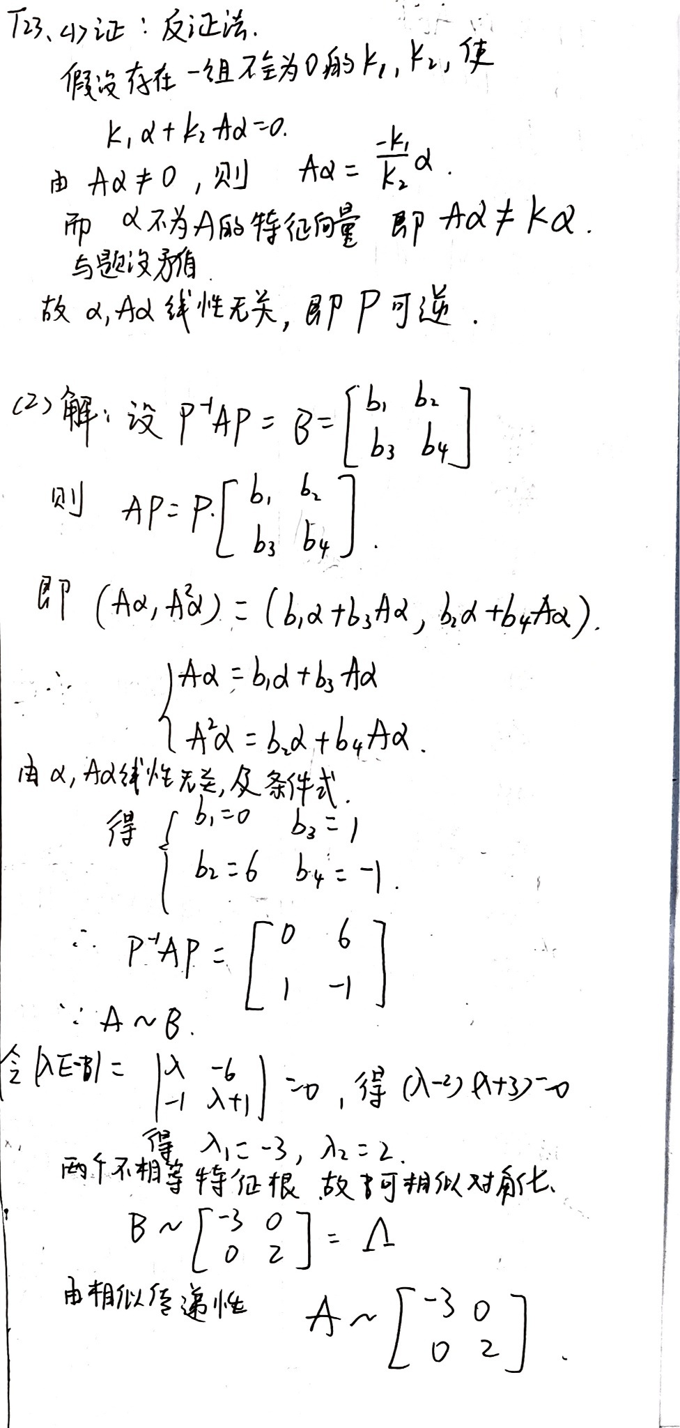 学生采用反证法证明P可逆。假设存在不全为零的k₁,k₂使得k₁α+k₂Aα=0,由Aα≠0推出Aα=(-k₁/k₂)α,这与α不是A的特征向量矛盾,从而α与Aα线性无关,P可逆。证明逻辑正确,关键步骤完整。但反证法假设中应强调k₂≠0(否则若k₂=0则k₁α=0,由α≠0得k₁=0,与不全为零矛盾),学生未明确说明k₂≠0,但通过Aα=(-k₁/k₂)α的推导隐含使用了k₂≠0,属于小瑕疵。扣1分。