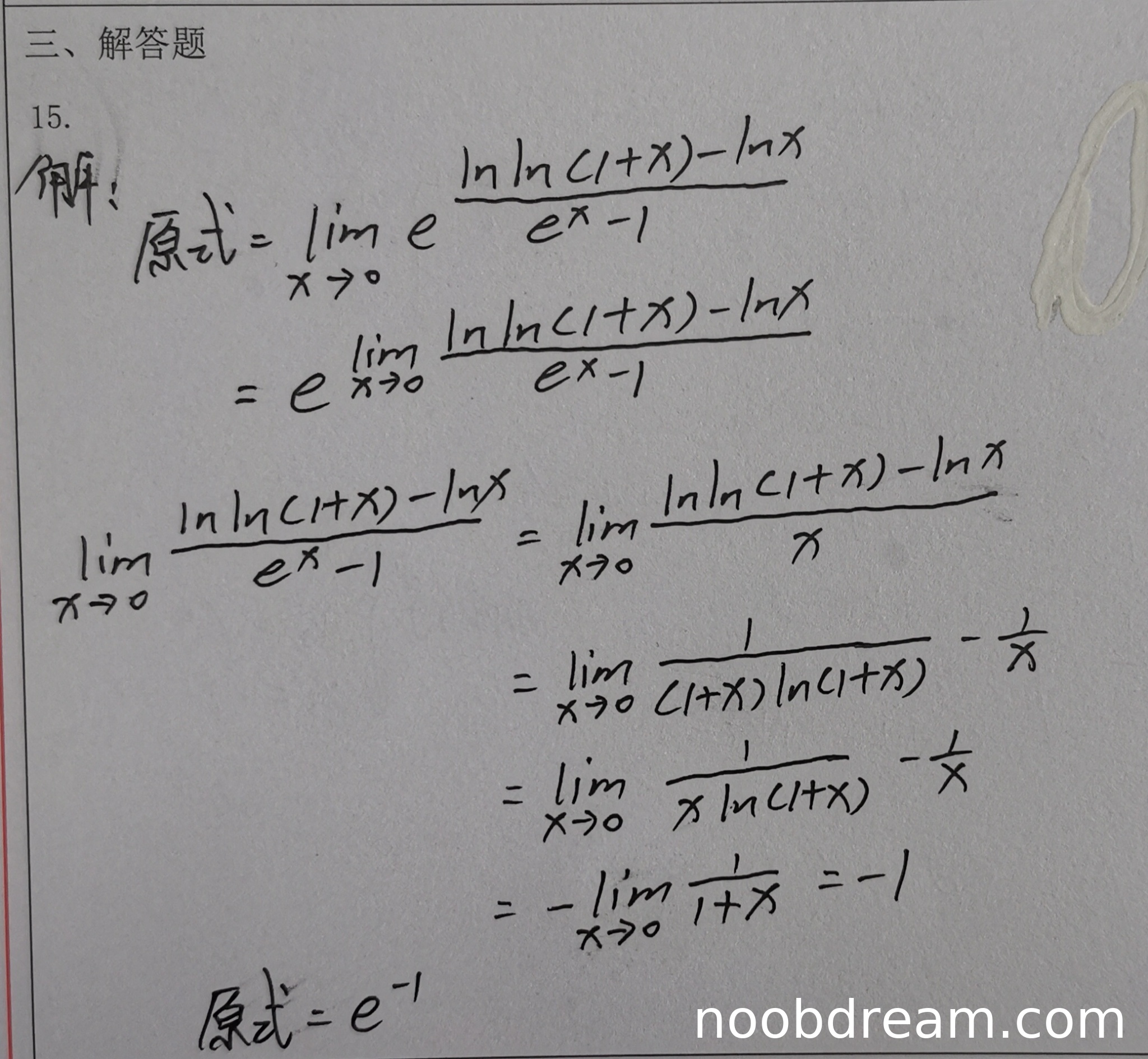 - 将原式写为 \( e^{\frac{\ln\left(\frac{\ln(1+x)}{x}\right)}{e^x - 1}} \) 的形式(学生写为 \( \frac{\ln\ln(1+x) - \ln x}{e^x - 1} \),这里存在符号错误,应为 \( \ln\left(\frac{\ln(1+x)}{x}\right) = \ln\ln(1+x) - \ln x \),但学生后续计算中实际上使用了这一等价形式,因此此处不视为逻辑错误)。